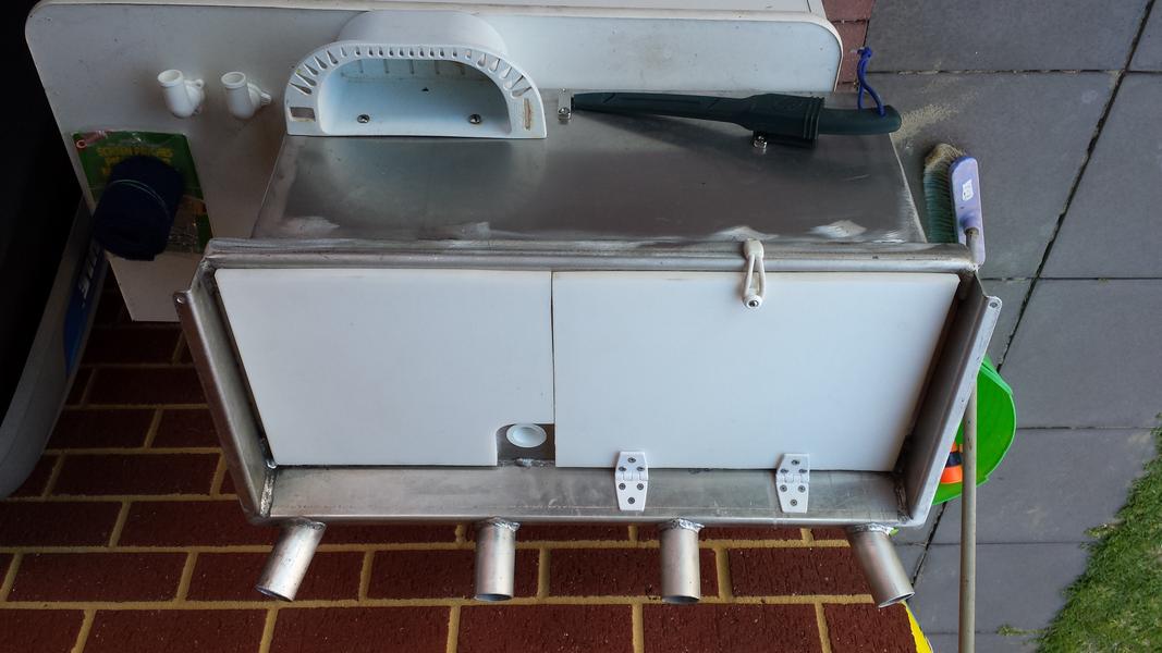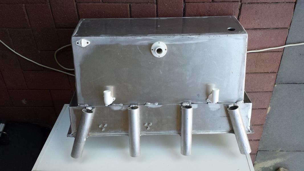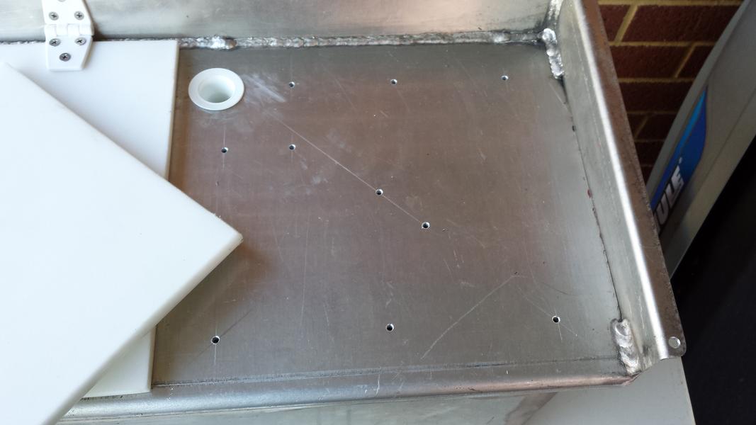 finished off cutting all the holes and trimmed the fixed cutting board to size. drilled through the ally top so that board can be screwed from underneath. fitted the drain top and bottom, bung and through deck skin fitting for the intake. drilled the mounting g holes on the boat and fitted it. Cut the holes for the overflow outlets but haven't drilled for the fastenings yet.