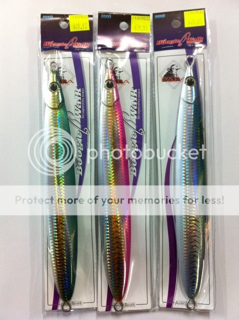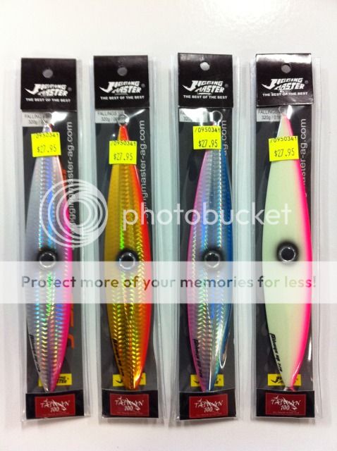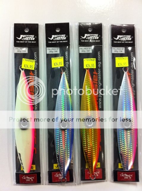 These Jigging Master Fallings jigs have been very popular for demersals and we've just received another big order. They are very well priced and the darting action of these jigs on they way up and flutter on the drop entices bites/gets results. We also have the larger ones in stock ie 260g & 320g which are ideal for sambos/amberjacks/skippy etc during the demersal ban time periond. These larger ones are also ideal for upnorth on rankins/reds/trout/goldband etc.
