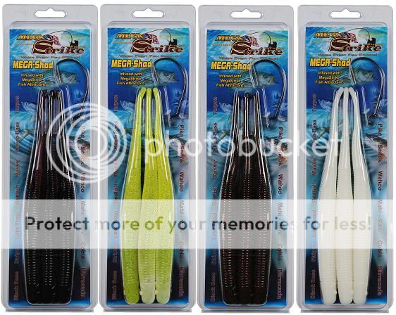 The 9 inch Mega Shad Lure is for serious fishermen wanting to catch serious fish. With its lifelike swimming action and its realistic profile, this bait means business. The MegaShad Lure is loaded with salt and infused with the MegaStrike™ Fish Attractant. The Mega Shad Lure comes 3 in a pack and also supplied with a super strong 8/0 Mustad Hook.