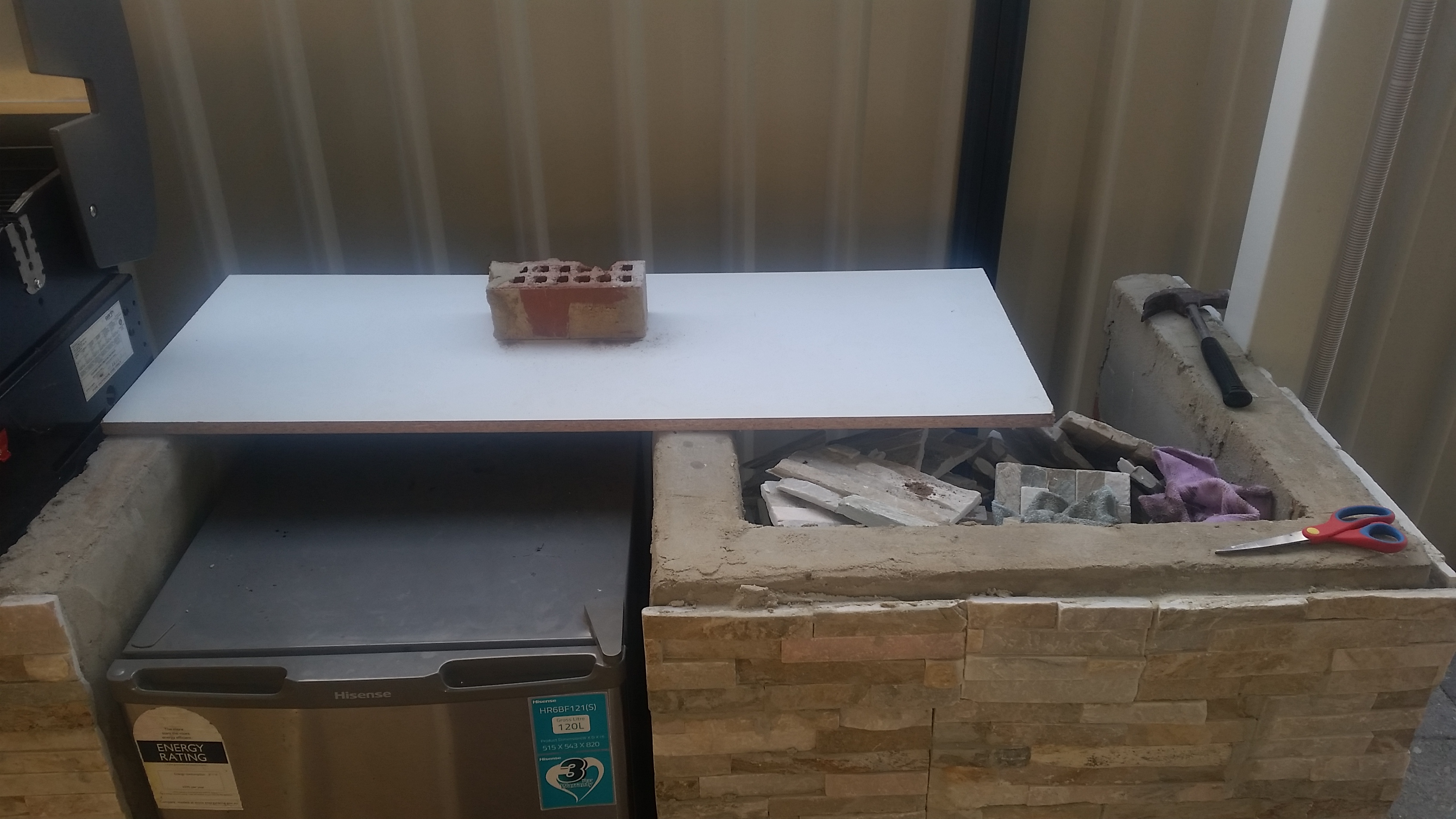 Made this outdoor kitchen, all from recyled products except for the bbq, not expierienced in this at all so did my best. looking for ideas for the benches, was going to put wood that is water proof then tiles. then i thought about stainless steel, then factory seconds of stone offcuts ??