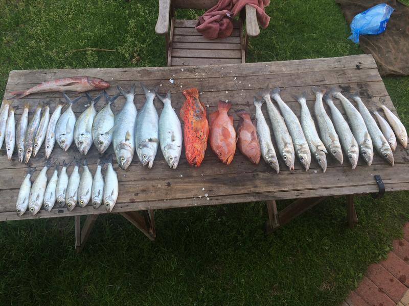 Anyway, we probably had our best day out on Saturday. Tried and tested lures for tailor around near shore reef first up, burley and bobby corks for herring and flashing lures for pike over shallow “patchy” ground, shallow beach with very light gear and small hooks for sand whiting and other bread and butter species, and then 20+m depth with burley on a range of “structure” for demersals and others using bottom bashing and floating rigs of various types. The image shows our bag (the competition day is the only time I would ever keep a lot of these – destined for the burley). We only fish near shore as we have a little boat.