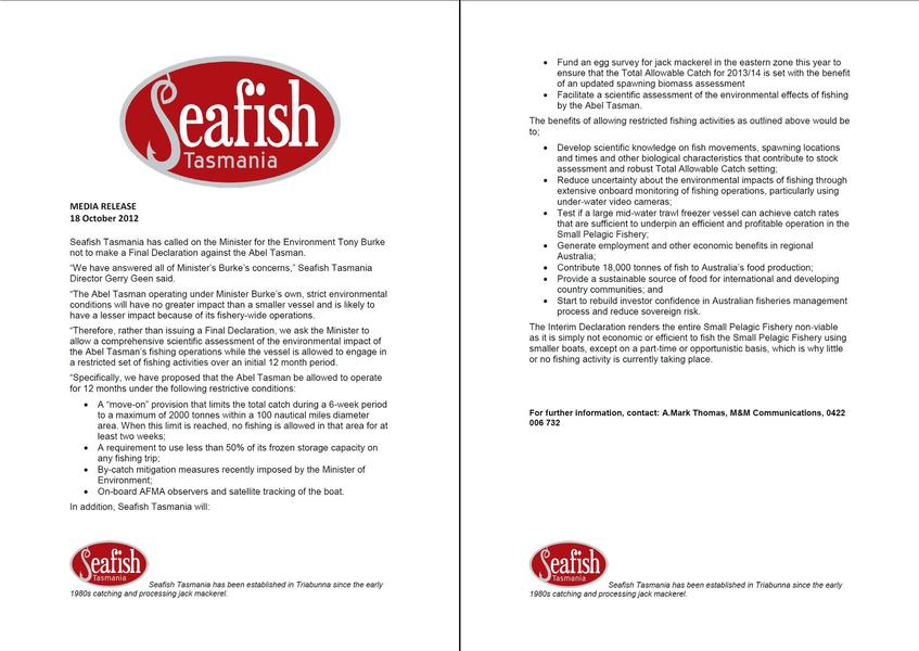 What is your opinion(s) of the Seafish Tasmania release published above?