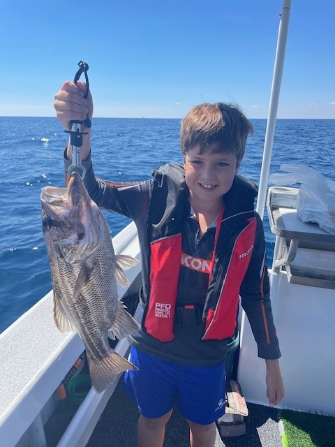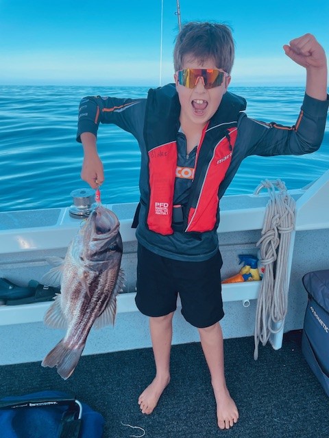 Both kids had their heads over the rail for a moment but they rapidly got distracted where, again, on the first drift, both rods went over and after a fun fight, another Dhu pops up to the surface, along with a Sargent baker.