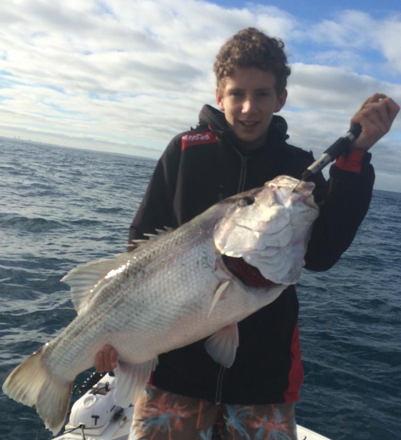 Not long after we were greeted to the squeal of YPM’s drag as something big took his carefully prepared snelled paternosta with whole squid and bonito slab cocktail. This fish had a lot of power and there was great disappointment when it clearly went under a rock in brick mode. YPM let the line loose and periodically put the heat back on to see if it had come out. I reckon the technique where we rig the sinker with much lighter mono might have paid off because I think the sinker broke off and the fish came free. YPM had clearly got it off the bottom and proceeded to play it to the surface. It was pretty exciting when we saw colour and the big dhu popped to the surface. Our net broke trying to fit it in and in a selfless act, Dean plunged his hands into its gob and hauled it aboard giving blood for the team. You have never seen a young fella as happy to get his prize.