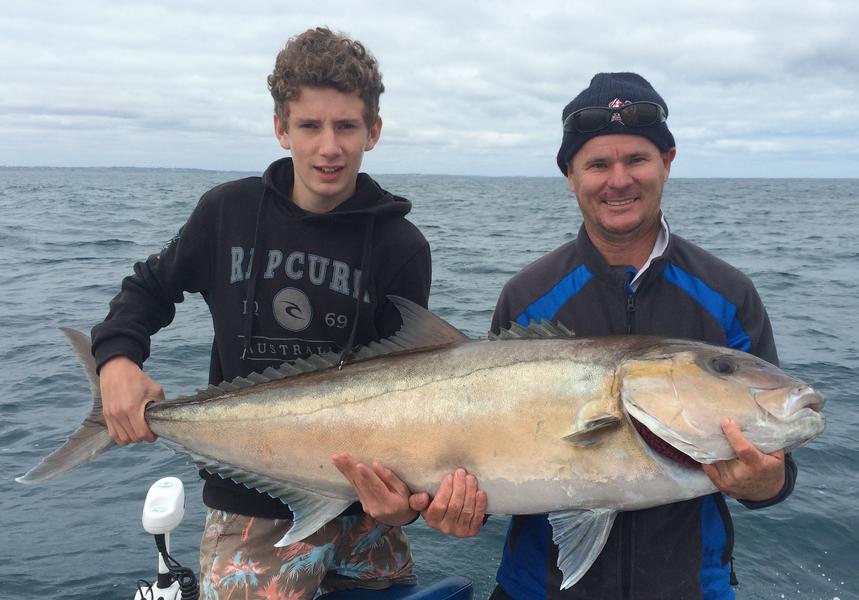 Then, YPM hooked up on an absolute freight train that looked like it was going to spool the 30lb braid. This one seemed much bigger than the rest and after about 25 minutes of torture for YPM we had to fire up the outboard to chase the fish and managed to get about 100m of line back. I must say the young fella handled himself fairly well and our only input was a few words of advice about not going too hard and moving things out of the way as it ran him around and around the Hornet – showing again the benefits of having this type of boat to try and land big fish on light gear. After 40 intense minutes we finally saw colour, and what a horse it was. A great relief to get it onboard for the young one after putting so much effort in. There was no way he could hold the fish up for the photo and its weight went past our 50lb scales.