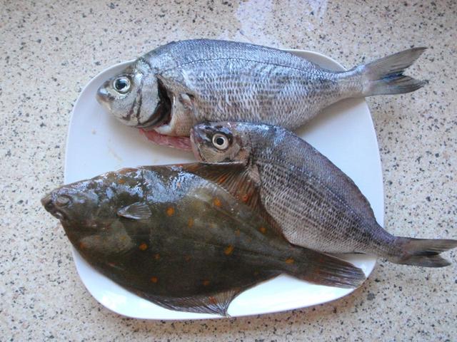 Went out again on sunday for the old mans birthday, and caught a few more fish.....! Trouble was we went to the pub for a quiet half saturday night, this turned into 6 pints and left us pissed and wondering what the morning will bring? We awoke at about 5 and got ourselves ready for the day. It was an hour and a half drive down and all the way we discussed the wind and conditions. Arriving nice and early on the boat we noticed the clouds break and the sun come out, although still blowing force 4 from the south west. We headed out in the lea of the shore and treid for a few mackeral for bait, they were small and hard to come by but eventually we got a few. We were after sea bream and fished a 3 hook dropper rig with worm and squid/mackeral as bait. It was hard going due to the boat going up and down but we were all catching.. Unfortunately only poor cod and pouting-rubbish fish-. After a move me and the old man started to catch bream and ended up with 3 each although one of mine was undersixe so went back. We also started catching dogfish and small bullhuss, all of which went back. We tried drift fishing for plaice and a managed a small but legal fish and took it back for the pot....my first plaice! We finished the day fishing close to the shore after getting beaten up by big waves and swell on the plaice grounds. Not a bad day all in all me and me dad did the best, as we fished light rigs with smaller hooks for better presentation, against the words of others but our method paid off, as noone else caught plaice or bream!! 2 weeks to go, i hope i leave the windy weather here!!!