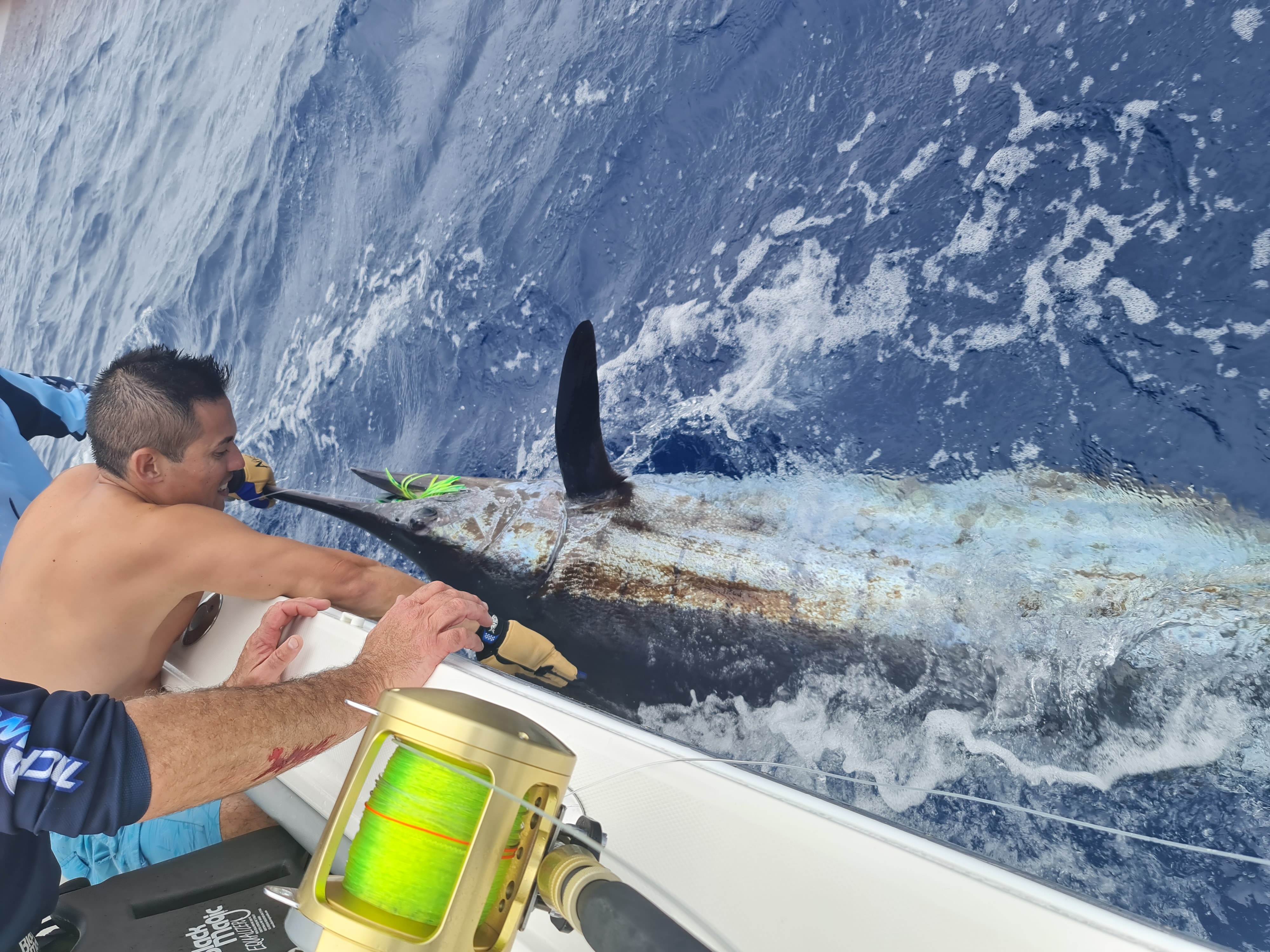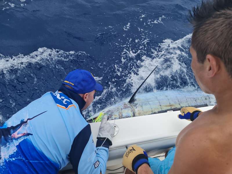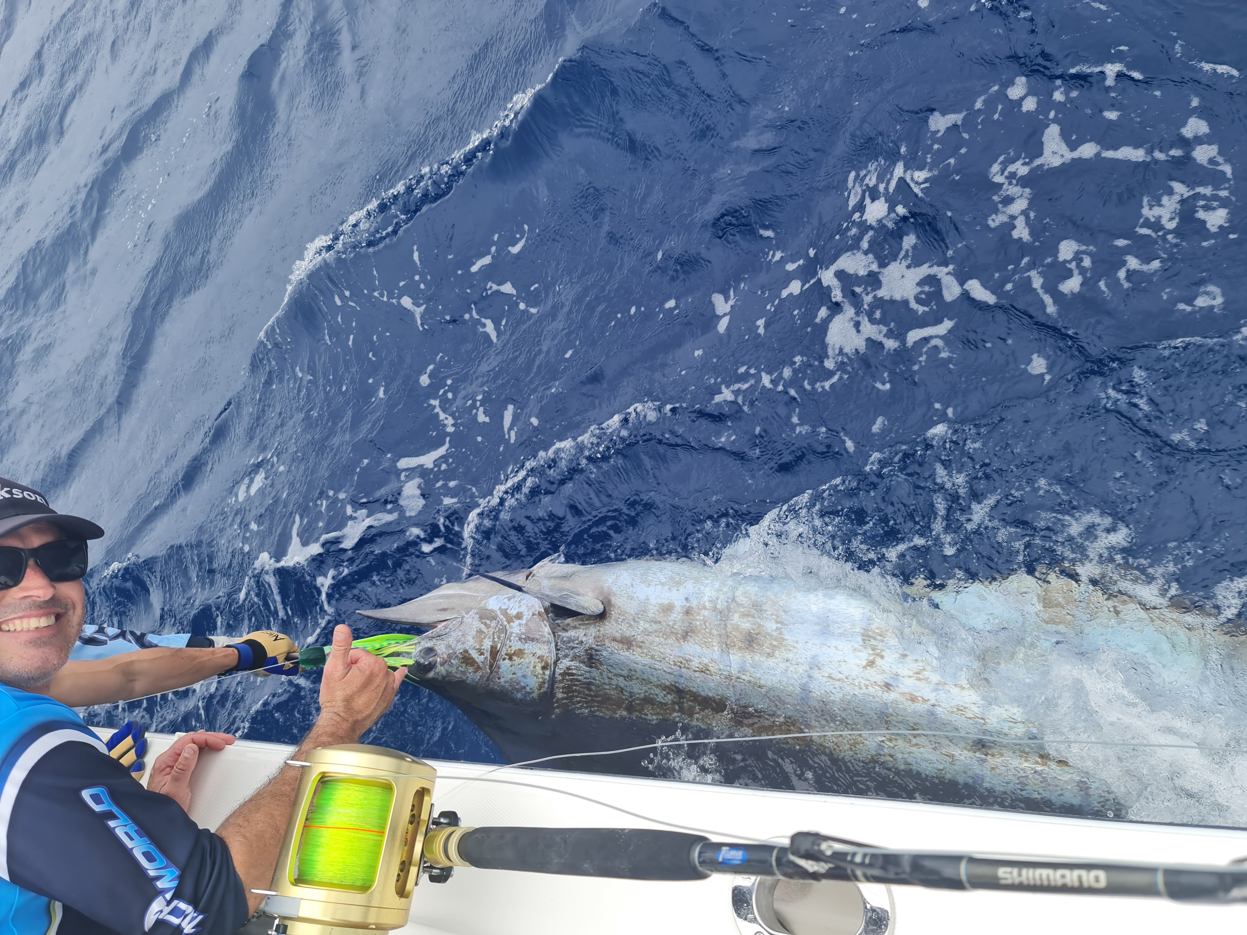 Another 10 minutes and we had it to the boat. One epic battle, we managed a few quick photos but this thing was not done, it rag dolled Bodie and Daz who were both hanging on to its bill, spat the hook and took off into the cobalt blue water....no need to swim this bad boy.