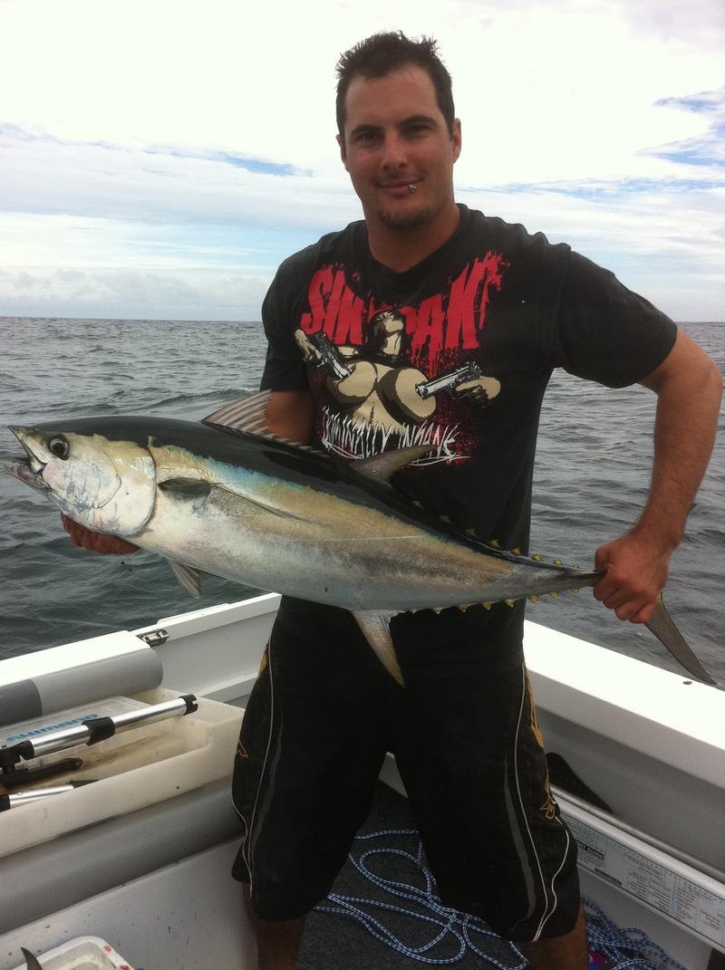 The next morning not looking quite as good as saturday we headed straight back out to the sambo hole but there was nothing out there. On the way out we had passed heaps of bait balls but no tuna so we chucked the lures out the back and had a troll around. After 10mins of trolling around the bait, Bads Stella 5000SW screamed! he was hooked up solid and this fish was running hard. After about 5mins he had the Striped Tuna boatside ready for the gaff.