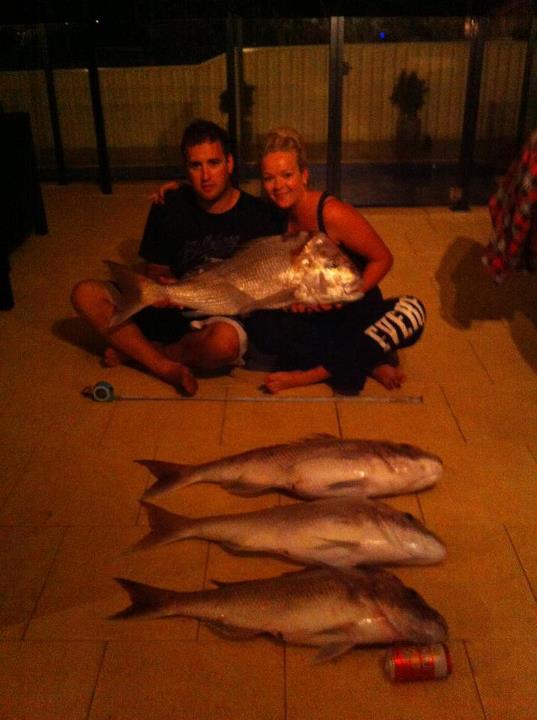 Reset the lines and my girlfriend then pulls up a big pinky measuring around the 10kg mark. Dad then hooks the biggest of the night weighing in around 11kg and measuring 97cm. Was hooked on a piece of squid on a single hook (was the snell rig that was bitten through before)