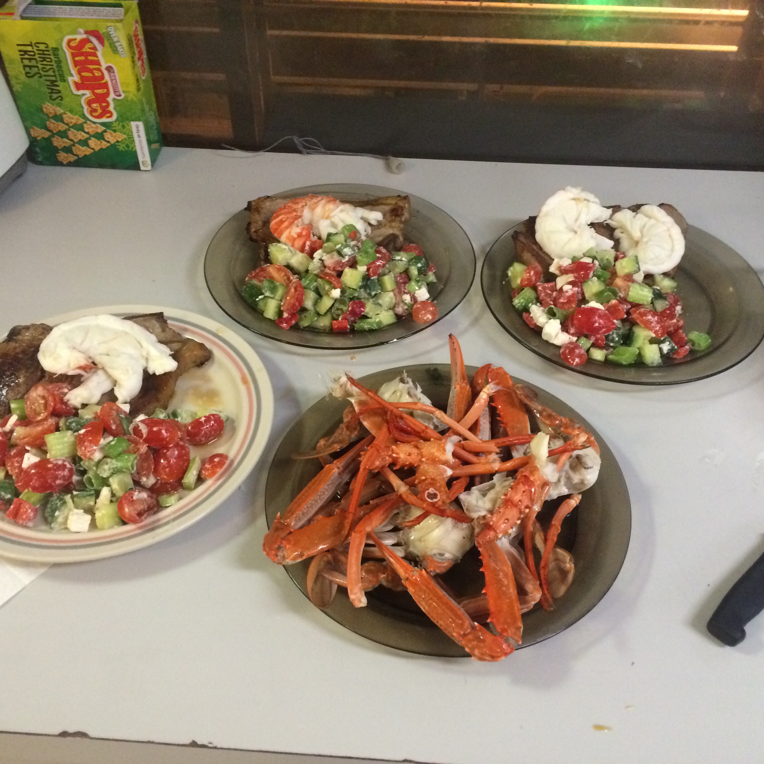 Cooked Feed up for few blokes at work.t/bone .salad.cray.&the good old Mandurah crab.:):):)