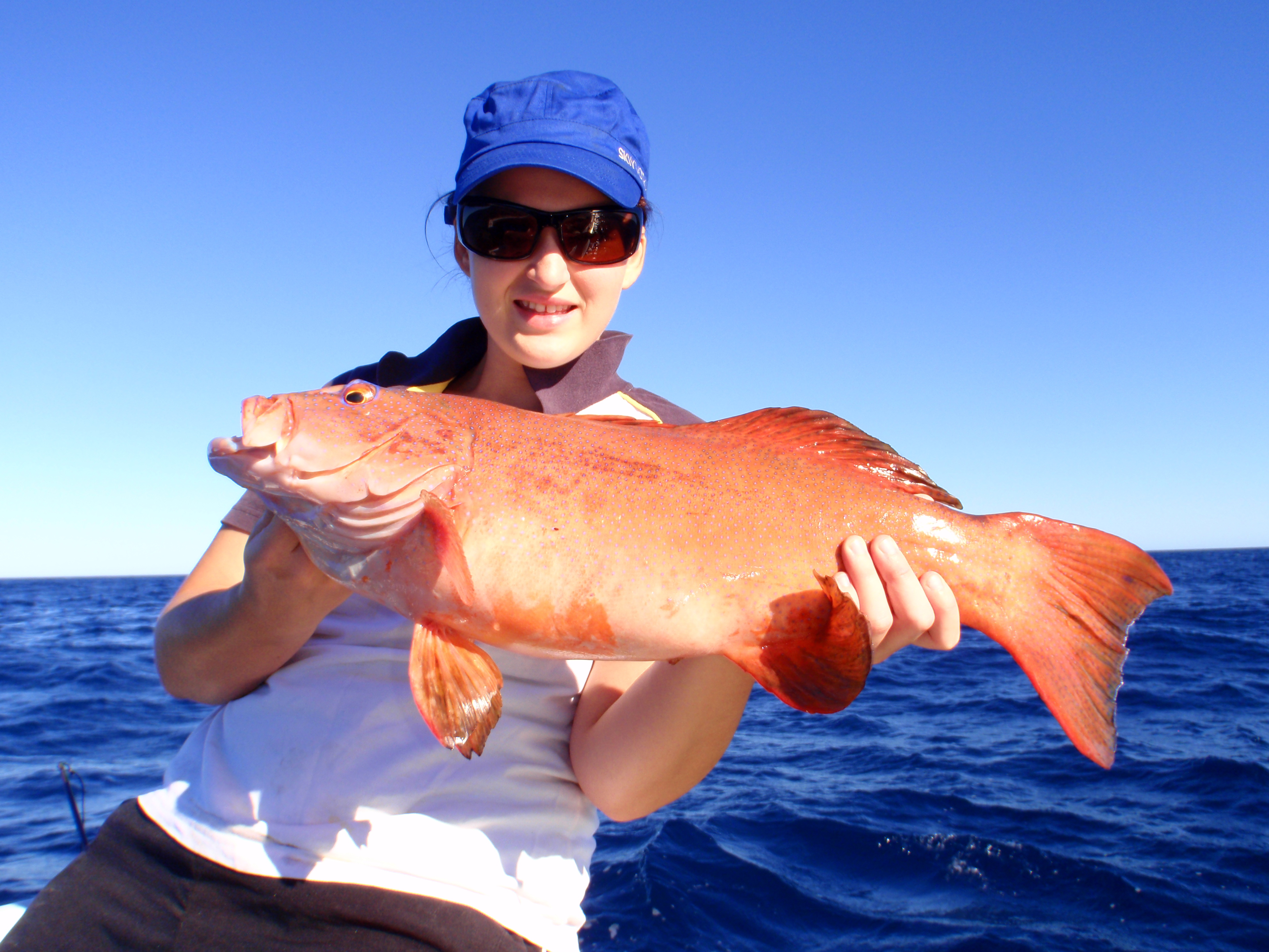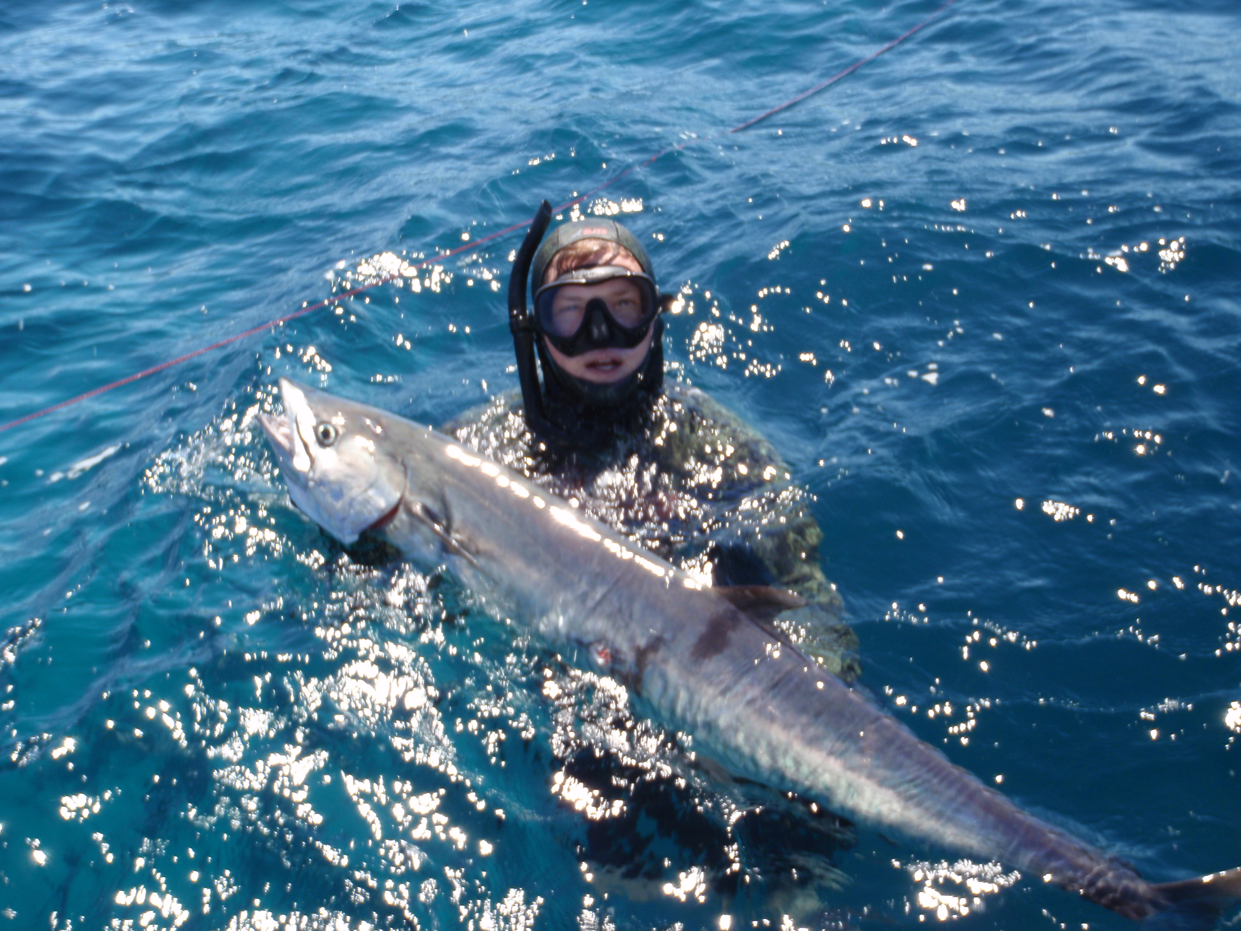 Yesterday morning bright and early saw us depart the Gero Marina for a spear. Conditions where par - average for majority of the trip to our first spot some 55k out.... Meggsie was along today for her first fish in along time so as we slowed to down approaching the reef i threw a X-Rap on 8kg out for her and the boys and i geared for a dive.... It didnt take long before the rod took off and the little tyrnos was screaming... First call was for a Spanish but it died in the bum pretty quick and meggs soon had a 6kg sharkie along side - despatched pronto ready for burley. She did a fantastic job considering she has never used an overhead before!. We reset the lure and did a few passes over some bait schools on the dropoff for one more hit before we anchored and got wet.. The dropoff was 16m down into 35..
