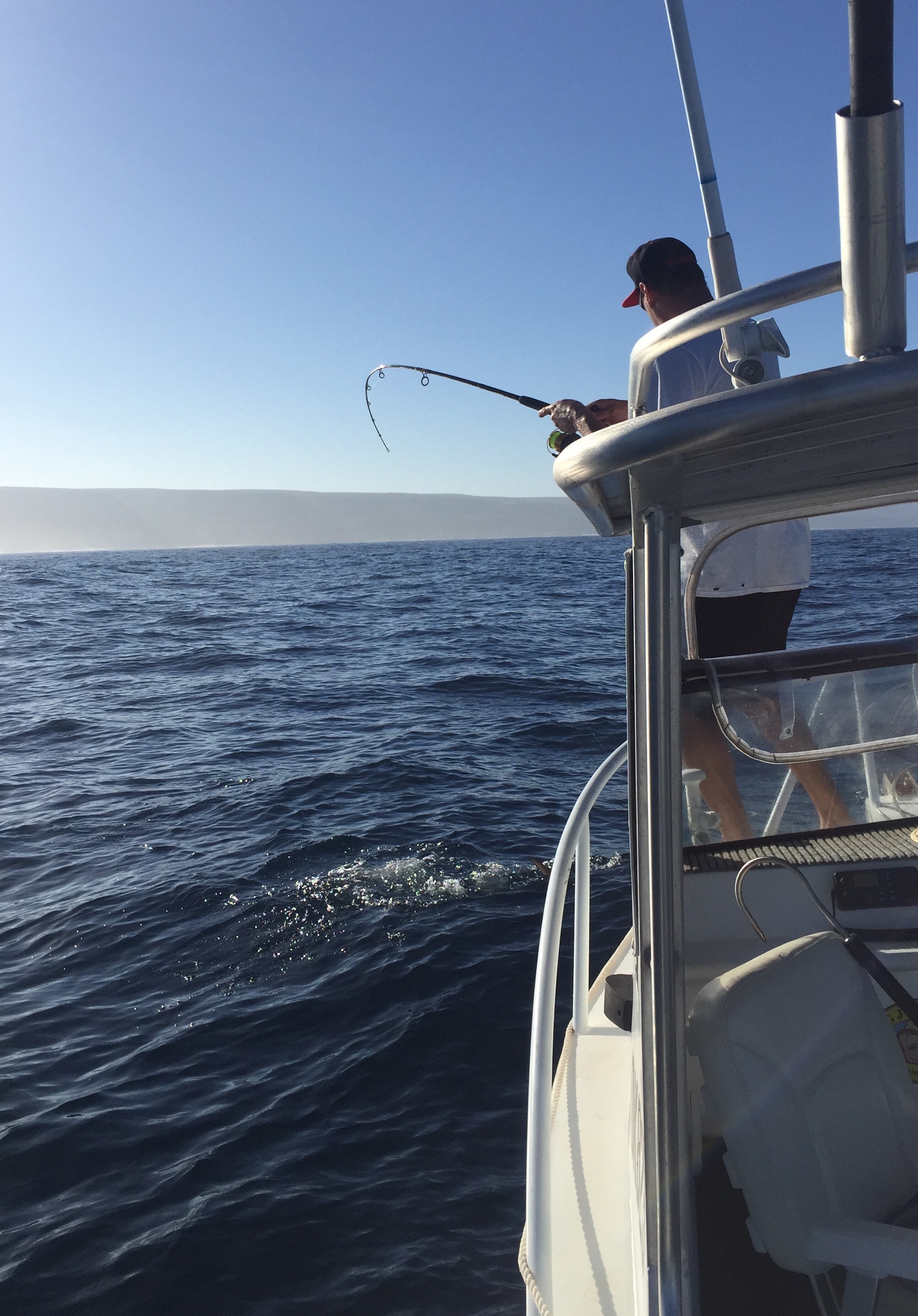 Blasted back to our spot where Dad hooked up to a good fish on 6kg, unfortunately the double popped after about 20 minutes with the fish about 15 metres directly under the boat. We worked the area unsuccessfully for about half an hour until the sun poked over the cliffs and started hitting the mirrors on the witchdoctor teaser. The fish went crazy for about two hours, we blew a lot of fish again to pulled hooks and the occasional shark.