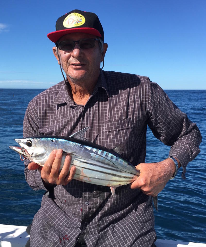 Slow start on the fish, nothing to show after the first 90 minutes, causing the skippers nerves to start jangling. Desperately we cycled through some artists on the Fusion Stereo until The Rolling Stones got things started. A nice mack for Paul on 6kg and then another one about an hour later calmed a few nerves onboard. All hell then broke loose when we hit a hot patch of fish resulting in a quadruple hookup, Dad was the only the one to boat one though, with a couple of hook pulls and a broken stainless leader about 5 metres under the boat for Paul. I hooked two more good fish on 3 and 4 kg string but the taxman came into play once again as the fished neared the boat.