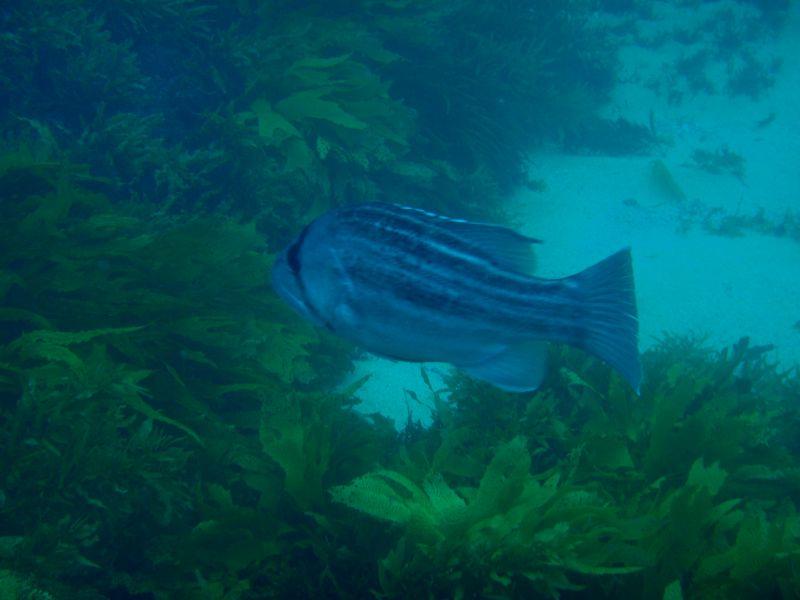 Forecast was for fairly light sth-west winds which where pretty much spot on and made the trip fairly slow but not too bad but the grey overcast skys and intermittent rain showers didnt help the viz once in the drink! Arrived at about 845 and geared up. First in the drink was robbie and he came up stoked the water was clear as and fish everywhere! I jumped in armed with the camera in a attempt to get some nice shots - that lasted all of a min when a monster baldie came ghosting in from the gloom. Tim traded my riffe for the camera but it was too late the fish had continued on...