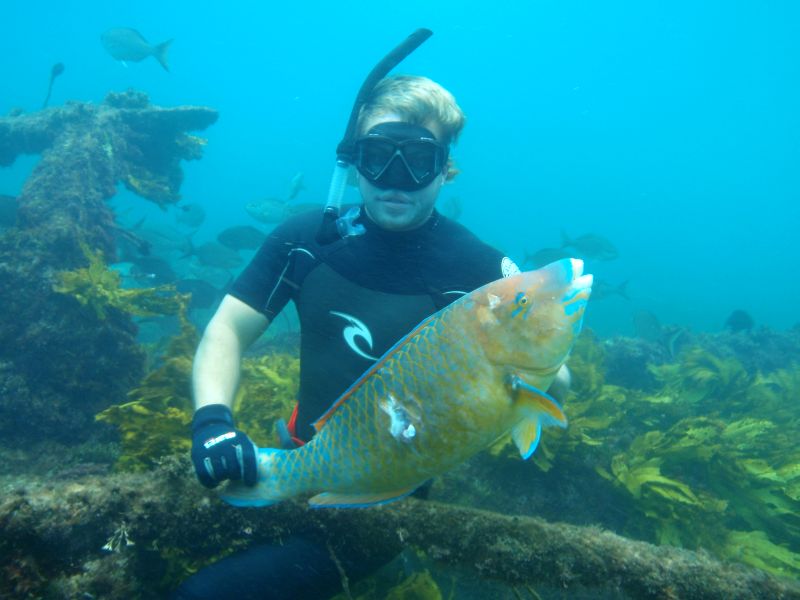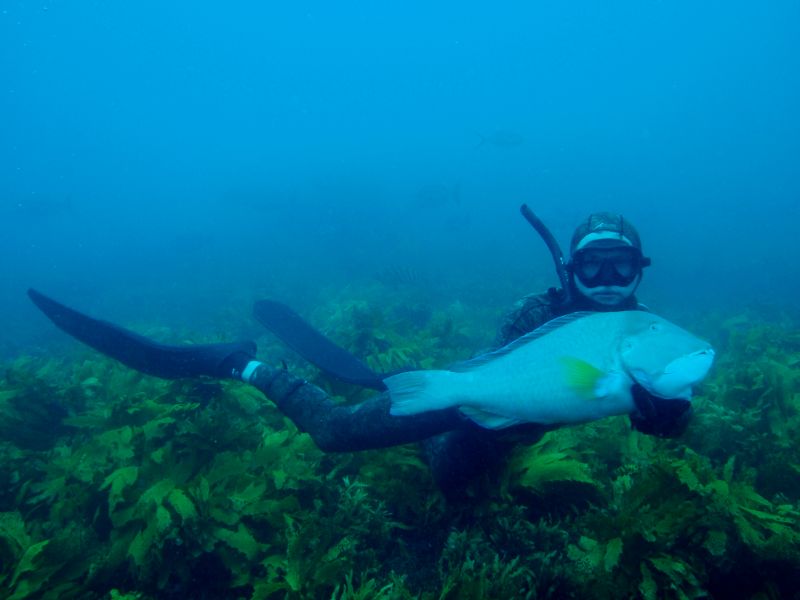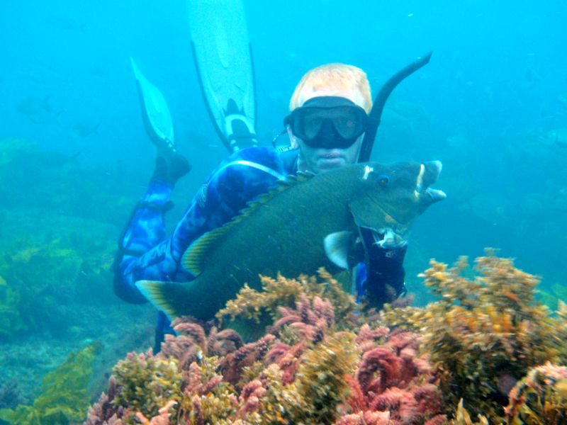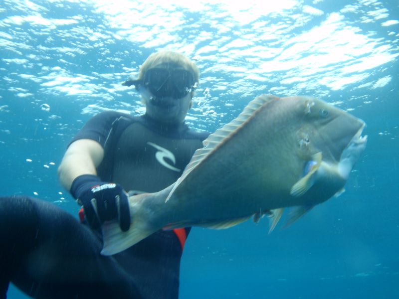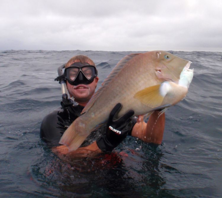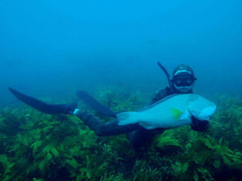 Went for abit of a swim and came across a nice groper of about 4kg so my first shot had me on the board and we where on our way.... Dropped the fish at the boat and swum over to find tim and rob on some beaut looking ground in about 10m and timmy just dealing with a superb baldchin of about 6kg! Great Fish....
