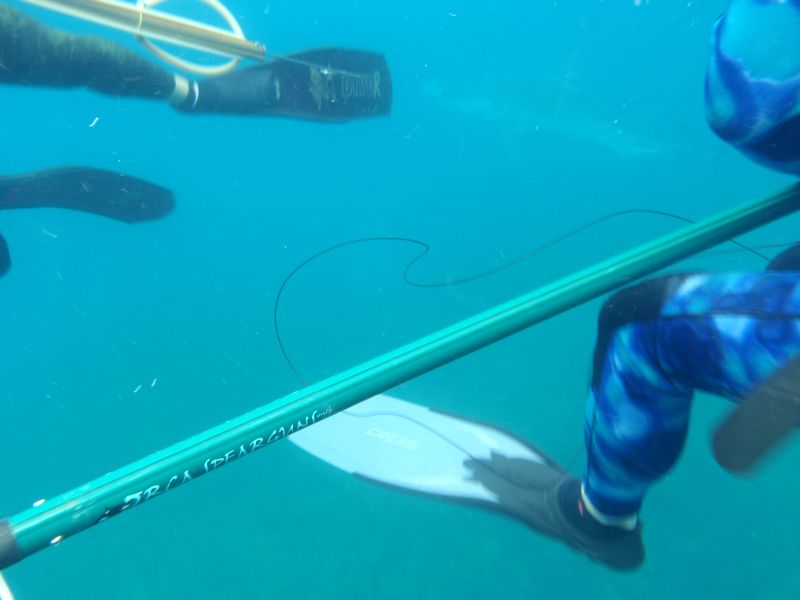 Moved out into some deeper water which proved fruitless so headed back in to try find the area i saw the spangos before.... Stumbled across some ok looking ground nothing spekky but set about spearing a buff and getting some action happening... One small sambo of about 15kg came looking but was let continue on his business and then suddenly the spangleds appeared... Timmy was following with camera and i was flat out trying to burley these flighty fish in closer when rob gave us a warning yell! "OI LOOOKOUT"