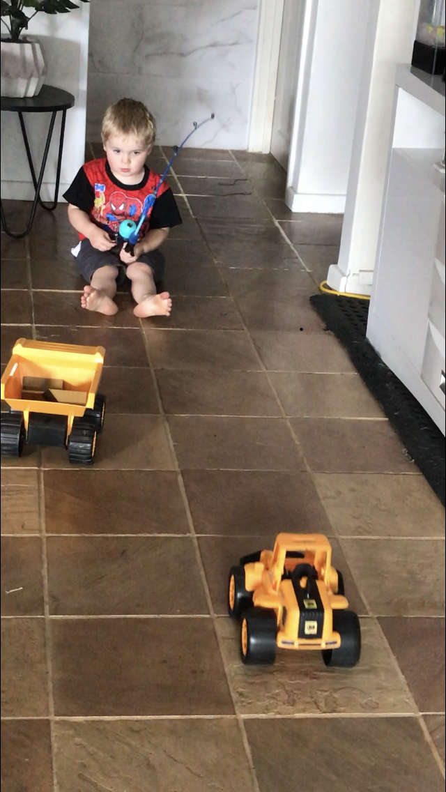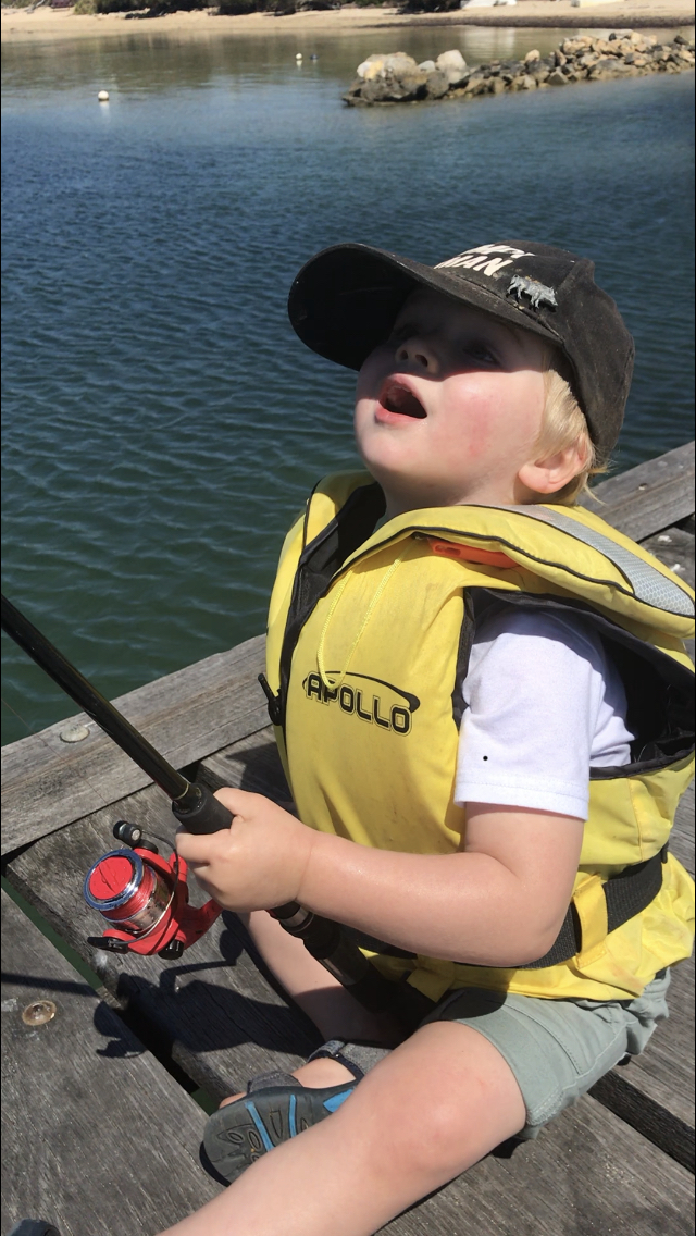 Tie there favourite truck to closed face real . They soon learn how to reel truck in. Take them to local jetty . Don’t let them wipe hands on wooden jetty. Cost to much in lollies whilst pulling out splinters.