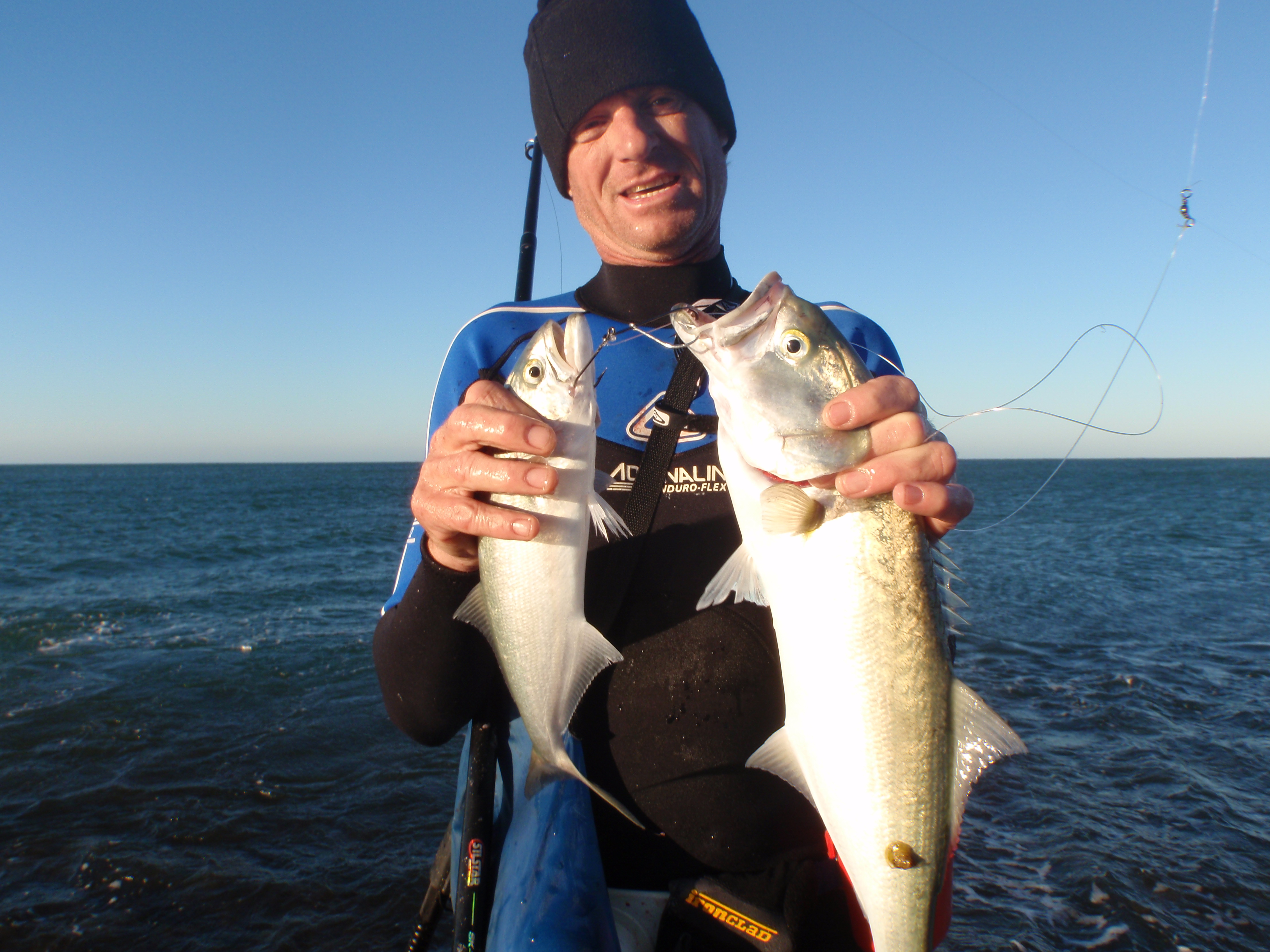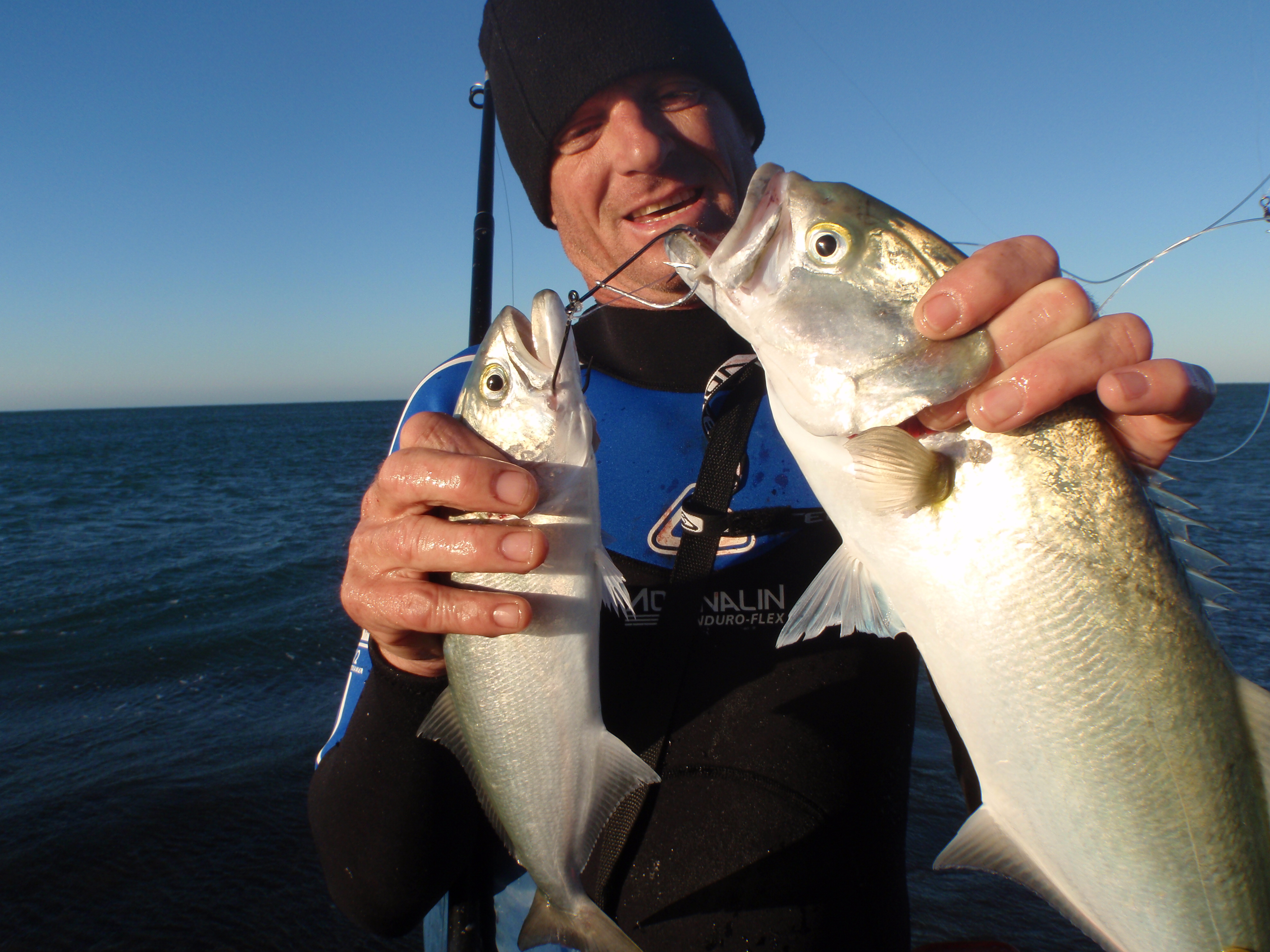 When they are feeding it's like a frenzie so these sort of hookups are not unusual. I'd be trying stickbaits and Halcos in those conditions.
