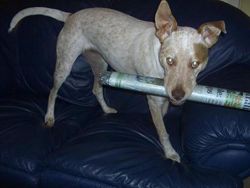He is a staffy called Buster. He loves people and enjoys seeing them writhe in agony when he treads oin their toes. He thinks that is some kind of game.