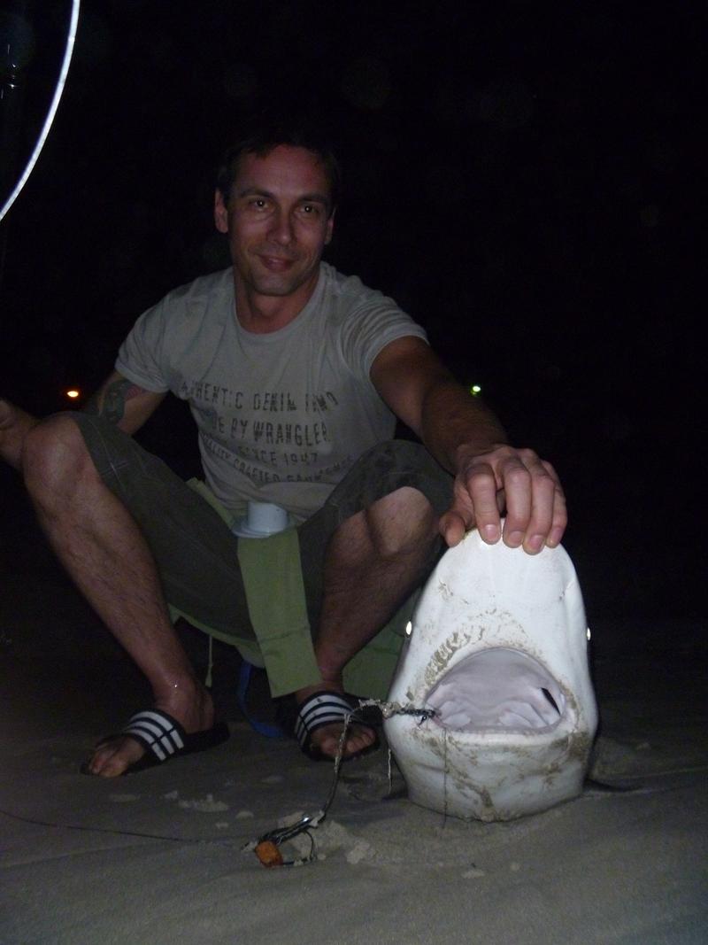 So we went out last night and I paddle out one big bait and one slide bait and one cast bait ( intended for ray so no steel trace). With all lines set the waiting and beer drinking starts! About an hour or so after dark the first run happens on the slide rod. I set the hooks and pass the rod to my brother. The fish does some nice short runs and my brother holds on to the rod, I think it took him about 2 seconds to be fully loaded with adrenalin. It was a bit of an effort for my brother cuz he is not used to overhead reels but after a few minutes his first shark ( a bronzi and it was approximately 1.3meter) was safely landed on the beach. We took some pics and then I released it.My brother was stoked!