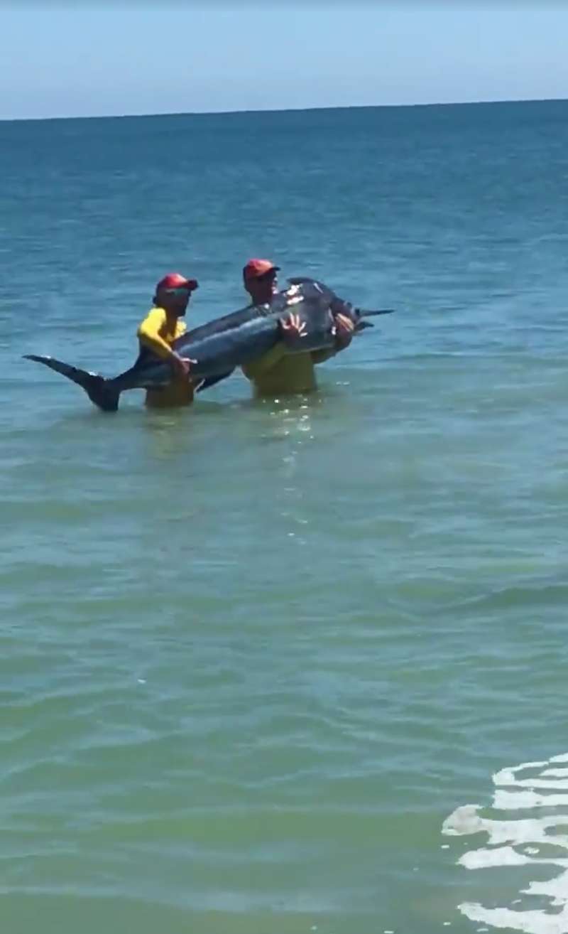 Heres a screenshot from a video posted on Facebook of a Marlin from one of Mandurahs northern beaches today. In the video it looks like the local Surf Rescue crew trying to revive a somewhat lifeless marlin.