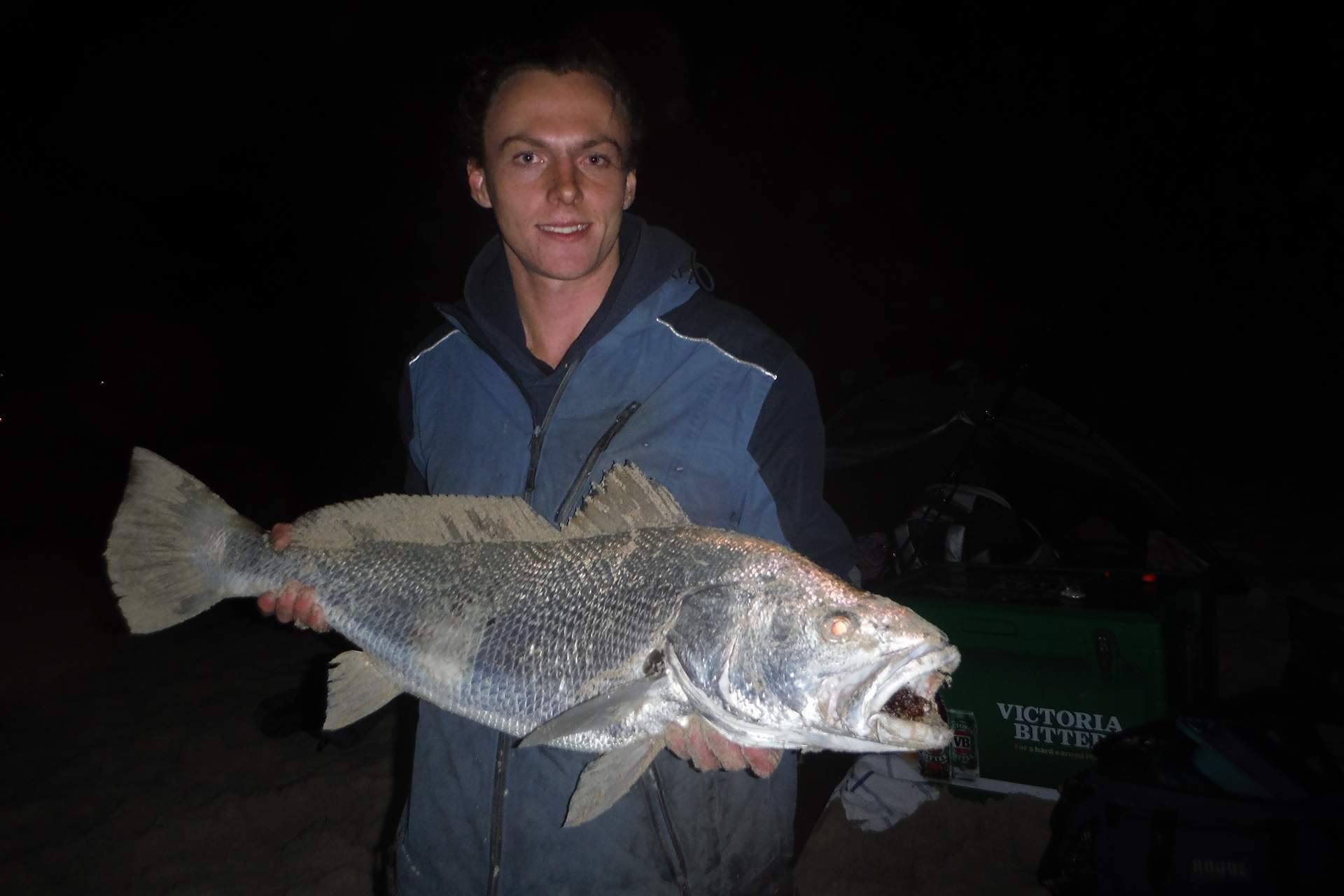 A small amount of weed hit the beach around my leader knot and as I shone the torch at it I thought I saw a glimpse of silver behind it so kept pulling and up washed a fish! I ran down and gilled a reasonable mulloway which came in at 96cm and just over 7 kilos. I was very lucky the circle hook had pinned it securely in the corner of the jaw and I didn't lose it considering the pressure I put on it and the fact I was only using 60lb leader.