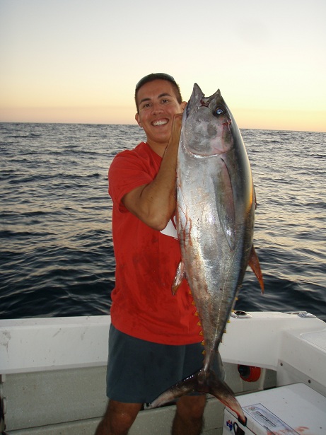 We had hooked up solidly to 2 fish. I worked mine up within a few minutes & called it a big macky until I saw some yellow sickle fins. With John tied up on his fish, I somehow managed to place a quick gaff shot behind its head. John continued to battle his fish for another 10 minutes until it finally hit the surface. Another gaff shot secured tuna number 2.