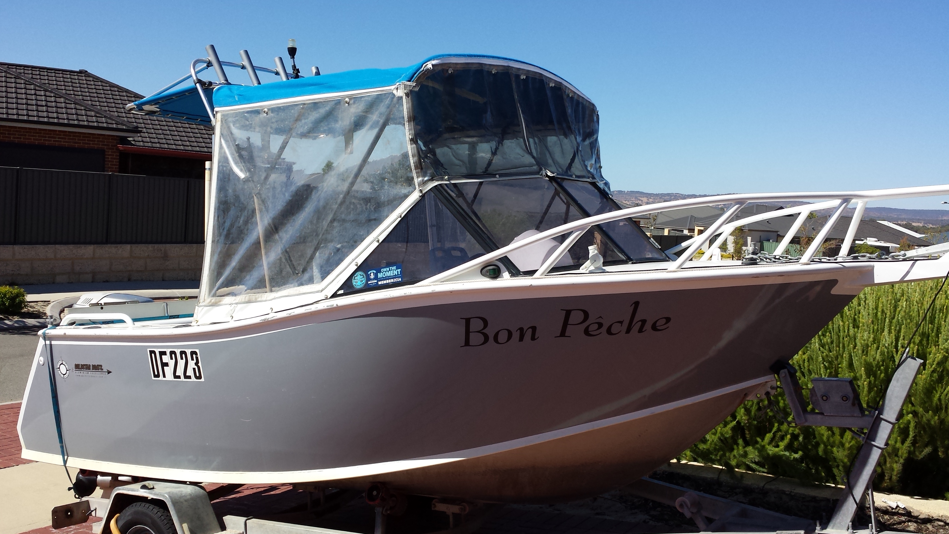 Goldstar 5m (painted) grey plate ali runabout "Bon Peche" will be on a mooring.
