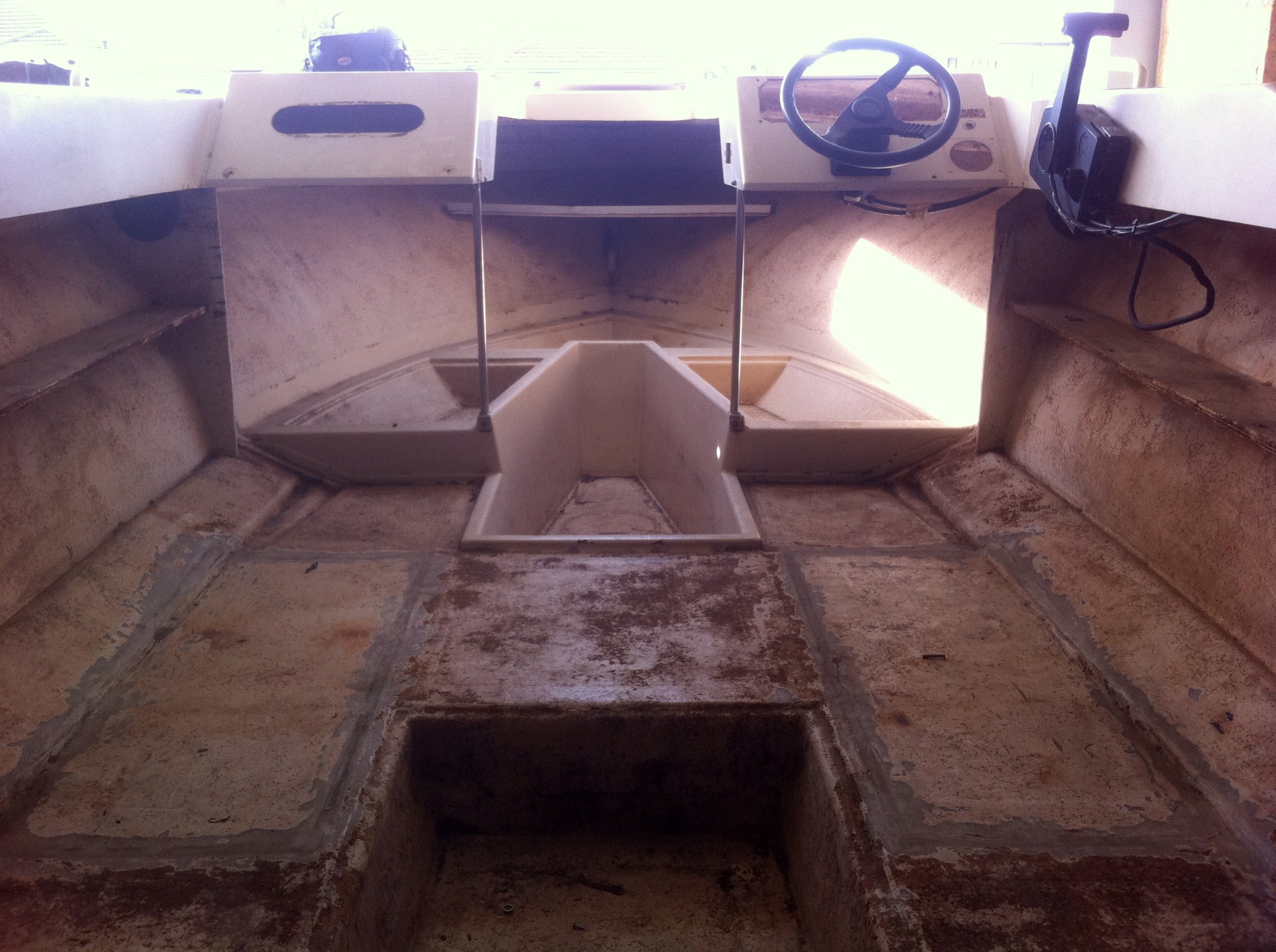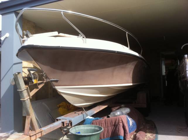 So the plan is a budget of 10 k approx to install new floors stiffen hull and stringers new side pockets custom pod with swim platform raise screen height with new custom dash to flush mount electronics built in esky's built in water tank built in fuel tank bowsprite full cut and polish and gecoat repairs where needed cold gal trailer finish brakes oh and a old 2 stroke which will be rebuilt .So this tub will be 21FT when i am finished and heavier a 225 hp should get this rig moving reason for the old engine low budget and can tune and maintain it our selves.Not the ideal engine for now but the opti will have to wait till the bank balance grows again.I will keep posting pics of the project proceeds showing you how the build progresses.