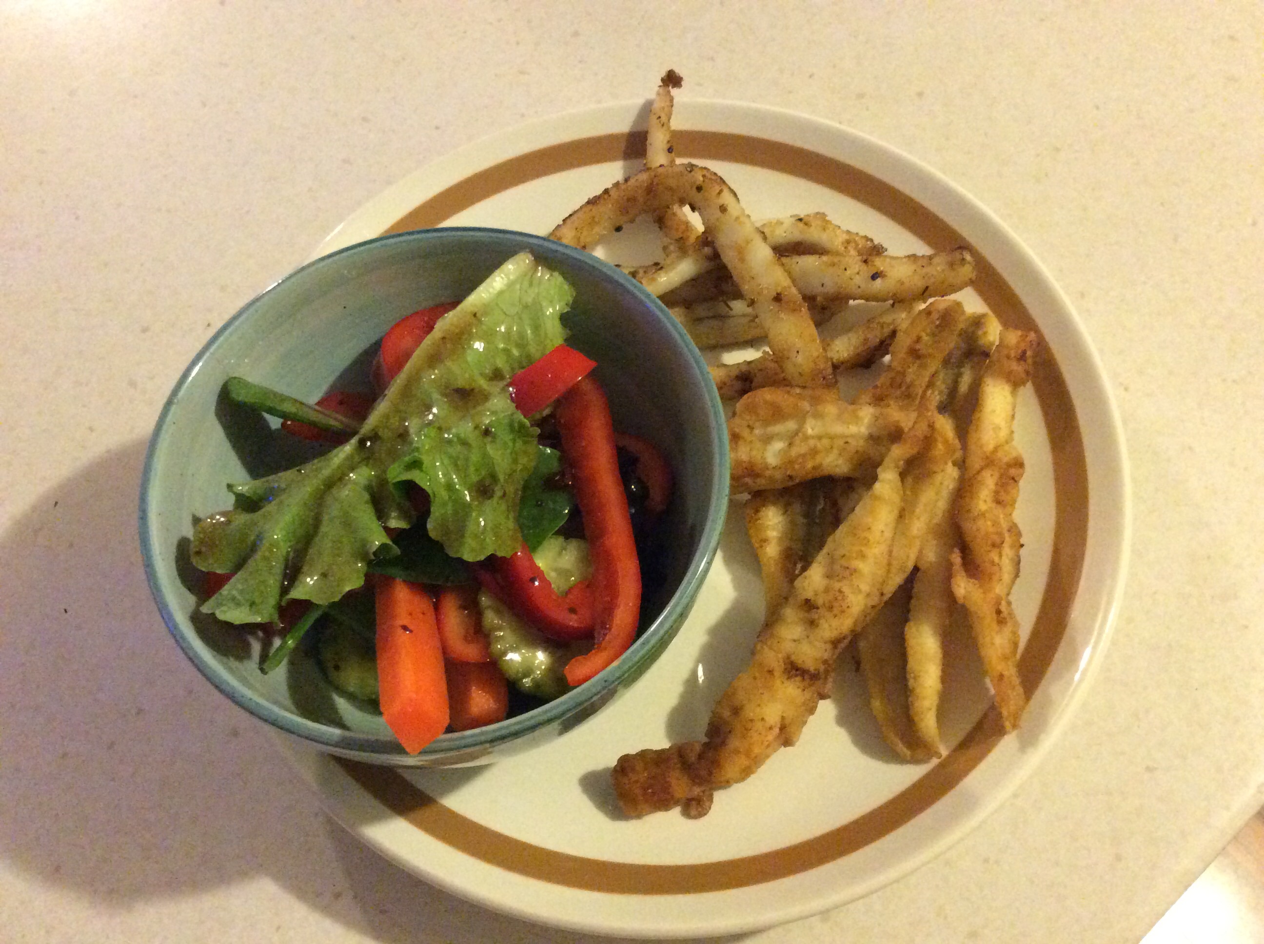 crispy whiting , garlic and herb squid and fresh salad .