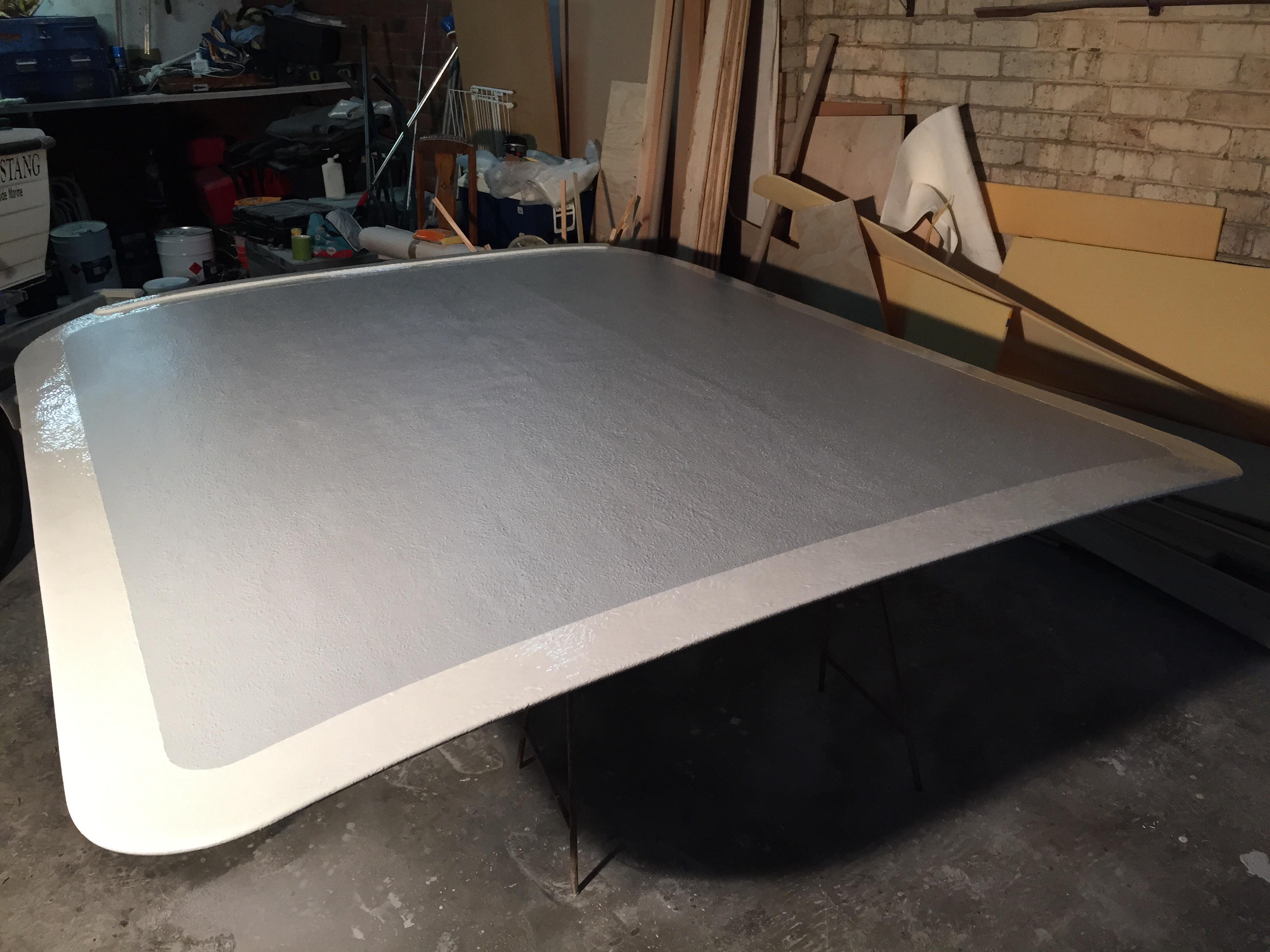 I knocked up a timber jig from pine and ply with frames shaped to match the aluminium frame to support the top so I could get the camber to match. Bought my 10 mm Corecell which is a composite foam ( rebuilt our whole boat with this product) from Kirkside Fibreglass in Ozzi Park stapled the sheets to the jig and glassed one side at a time. I would have liked to set up a infusion pump and vacuum bagged this for a real light weight product though as this is a very budget rig on a shoe string budget it wasn't to be.