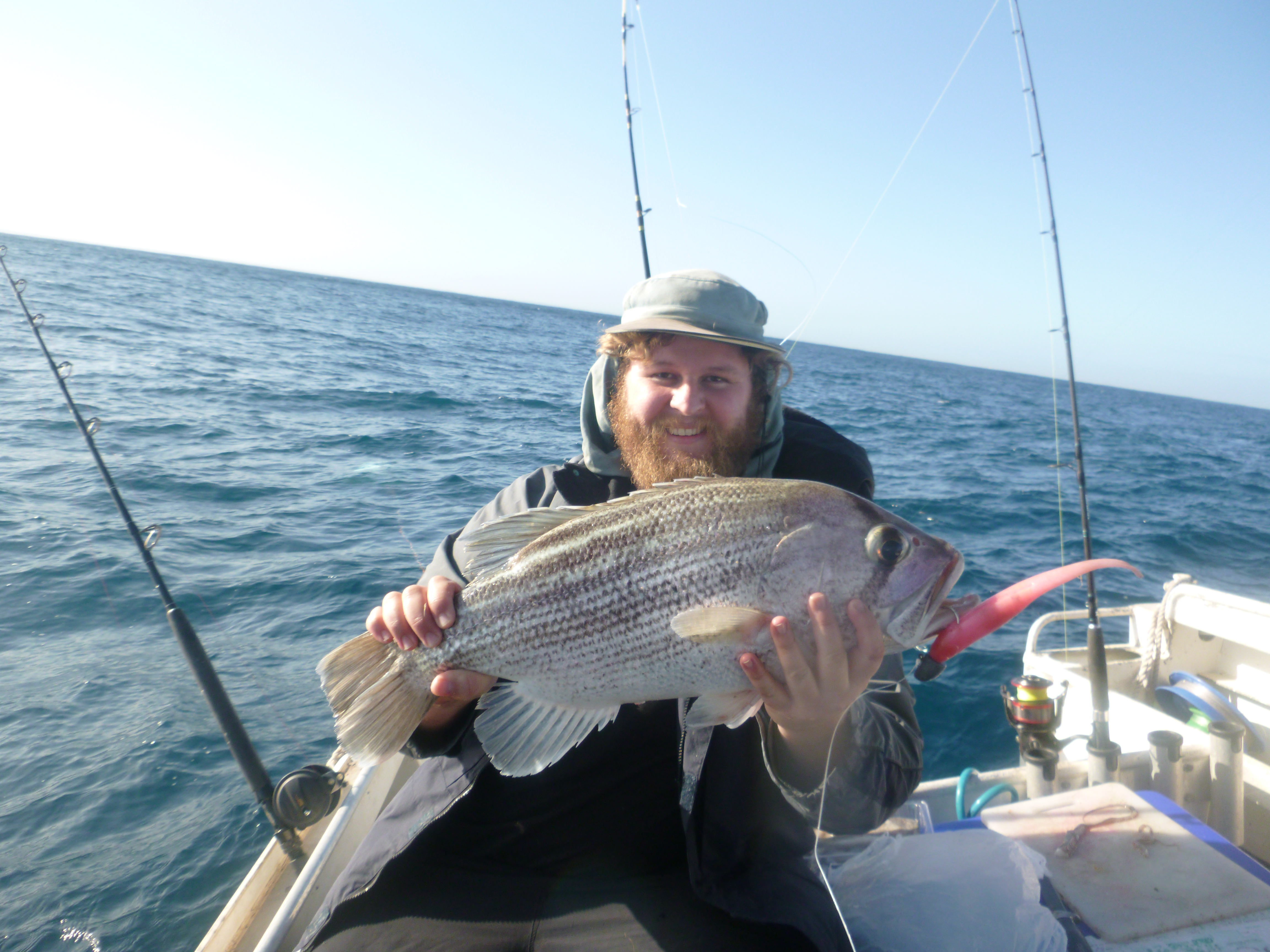 We stopped at 3 mile for 20 mins or so and grabbed some whiting for bait, then headed out about 8 miles to a spot my house mate had. He said he has fished there a few times and the ground looked good, but he's never actually caught anything there before. We had a couple of drifts with bait and nothing much was happening, so I dropped down a soft plastic and almost straight away hooked up on a dhu.