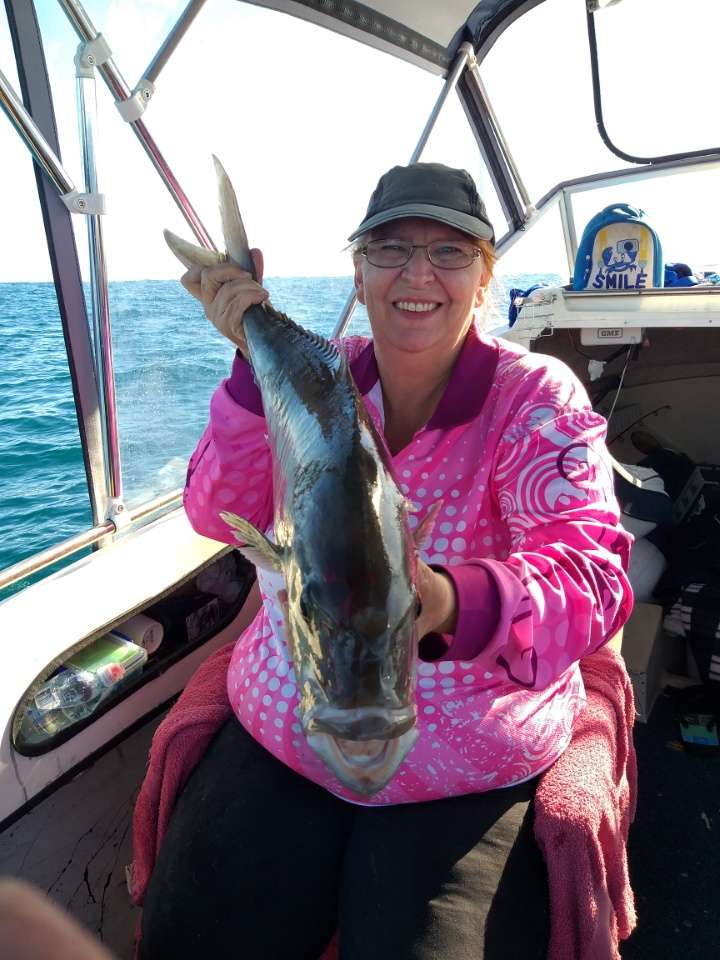 Got out today hitting the water at gentlemans hour of 8 am . Went out to target kgs to start and only managed 1 with a lot of pickers about. As the wind dropped we went out to the 40 mtr mark but not a lot biting at all. The water was a bit dirty even out there. Brenden nailed a nice cuttlue which ended up painting the boat and Sandy ,didnt think they would hold that much ink i t looked like about a litre sprayed everywhere.