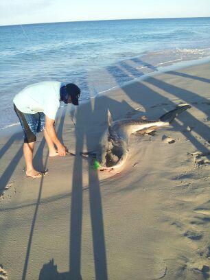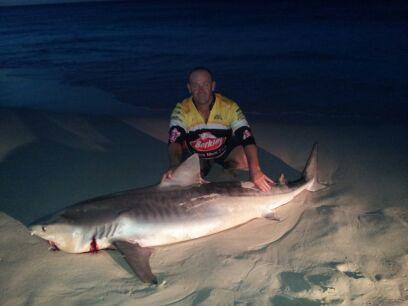 Sherbs woke me not long after as the wind had changed and he had got a balloon out. I had my first balloon out about 30 minutes later and waited for some action. In the next couple of hours I had a couple of big runs and ended up getting bitten off. The next balloon went out and I was hit about 600mtrs off the beach. In half an hour I had landed my first shark off the beach , the fact it was a 192 cm Tiger made it all the sweeter.