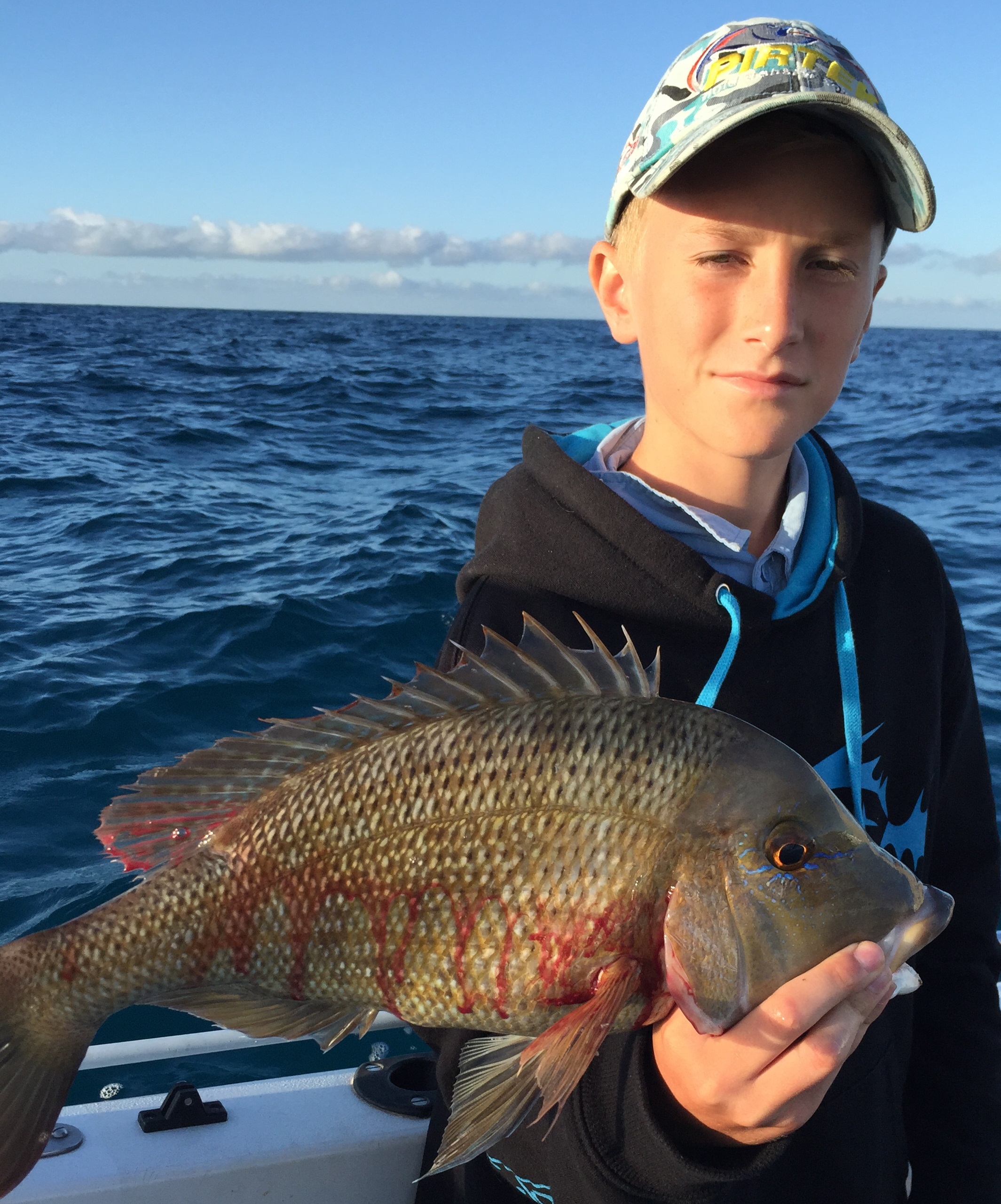 Off we go. The trick here was to cast your lightly weighted whole bait up current and wide and let the natural drift help you position the offering, and retrieve when you were “dragging it”. With the rate we were travelling in the current, a soft plastic out the back needed nothing other than to be towed along. Within a couple of minutes Tim-o (no not the one we all know) had a nice sweetlip in the boat.