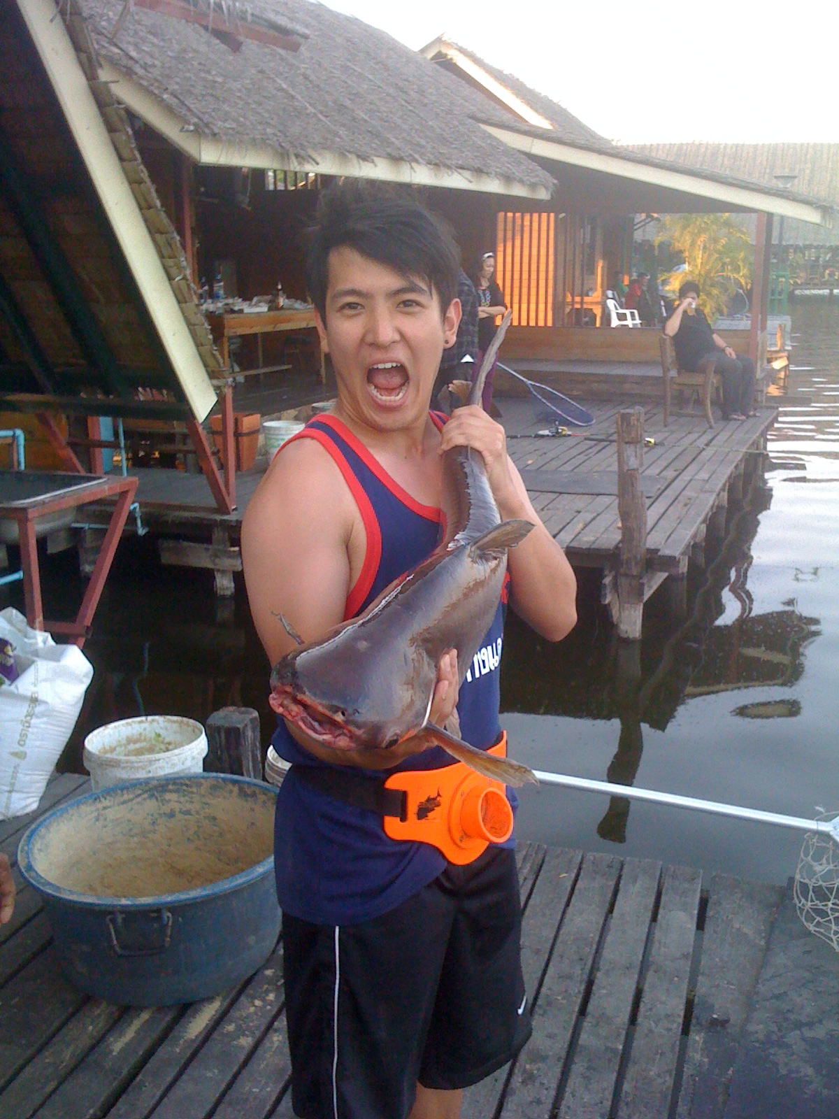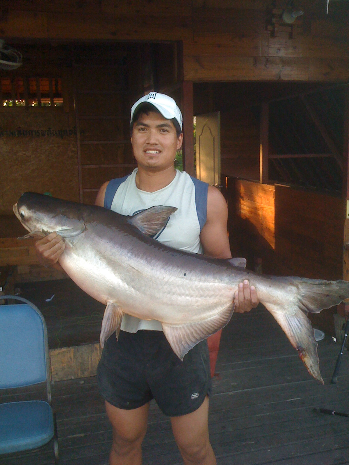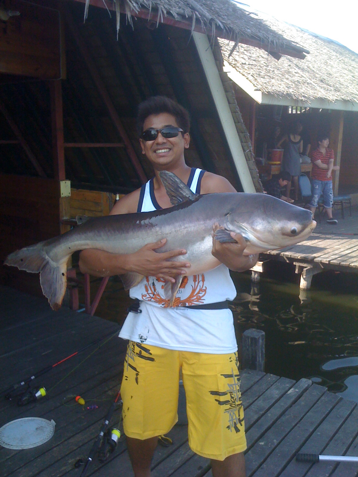In summary we caught about 16 fish in total from about 35-40 hookups with a few of them double hookups. All of our fish were mekong catfish (Ron did lose one very large siamese carp) averaging around 18-22kg although we did land two 'babies' at around 10kg. The largest reported catfish in the lake was around the 100kg mark so you can roughly extrapolate the size! Also in the lake were red tail catfish, one large arapaima (approx 450lbs) and giant freshwater stingray. It did cost a fair bit for a day trip at around 3500baht all up (just over 100 AUD) but I would recommend any Fishwrecked member to check it out if they are ever in bangkok and have a spare 12hrs :)