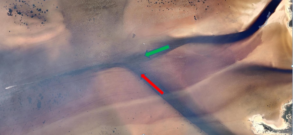 ...I would say the one coming out of the Serp (green arrow) has right of way. As far as the trolling goes, technically you're supposed to give way to vessels that are restricted in their movements, but that's a bit of a pisstake during Holiday Season in the Peel waterways!