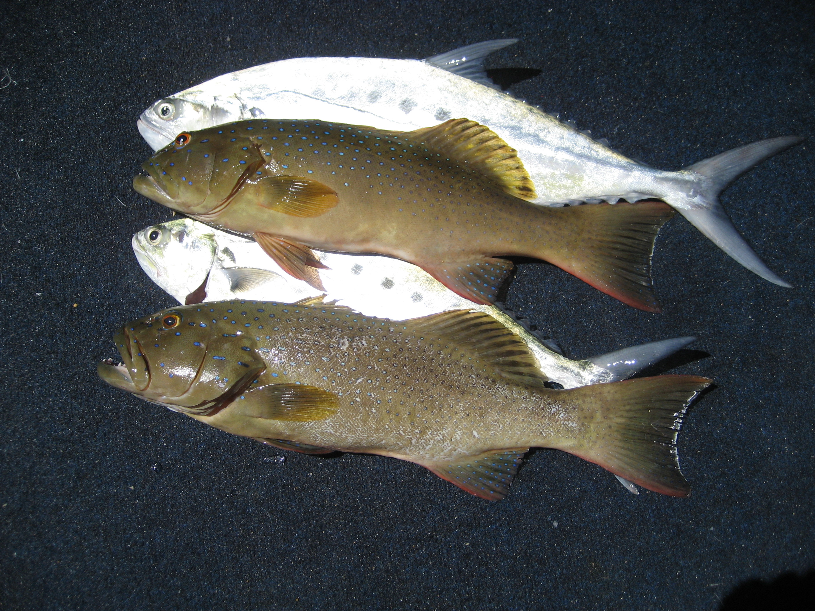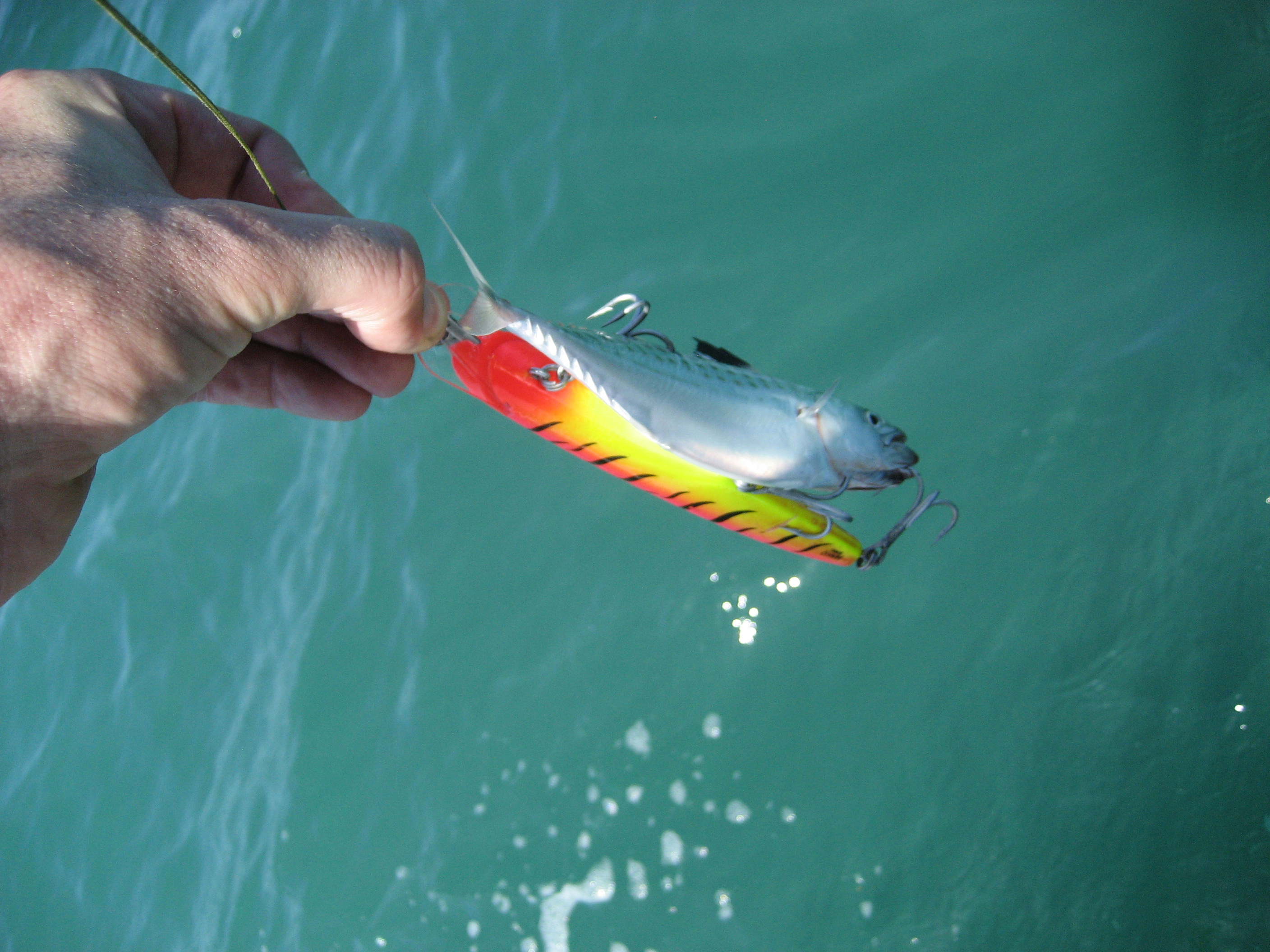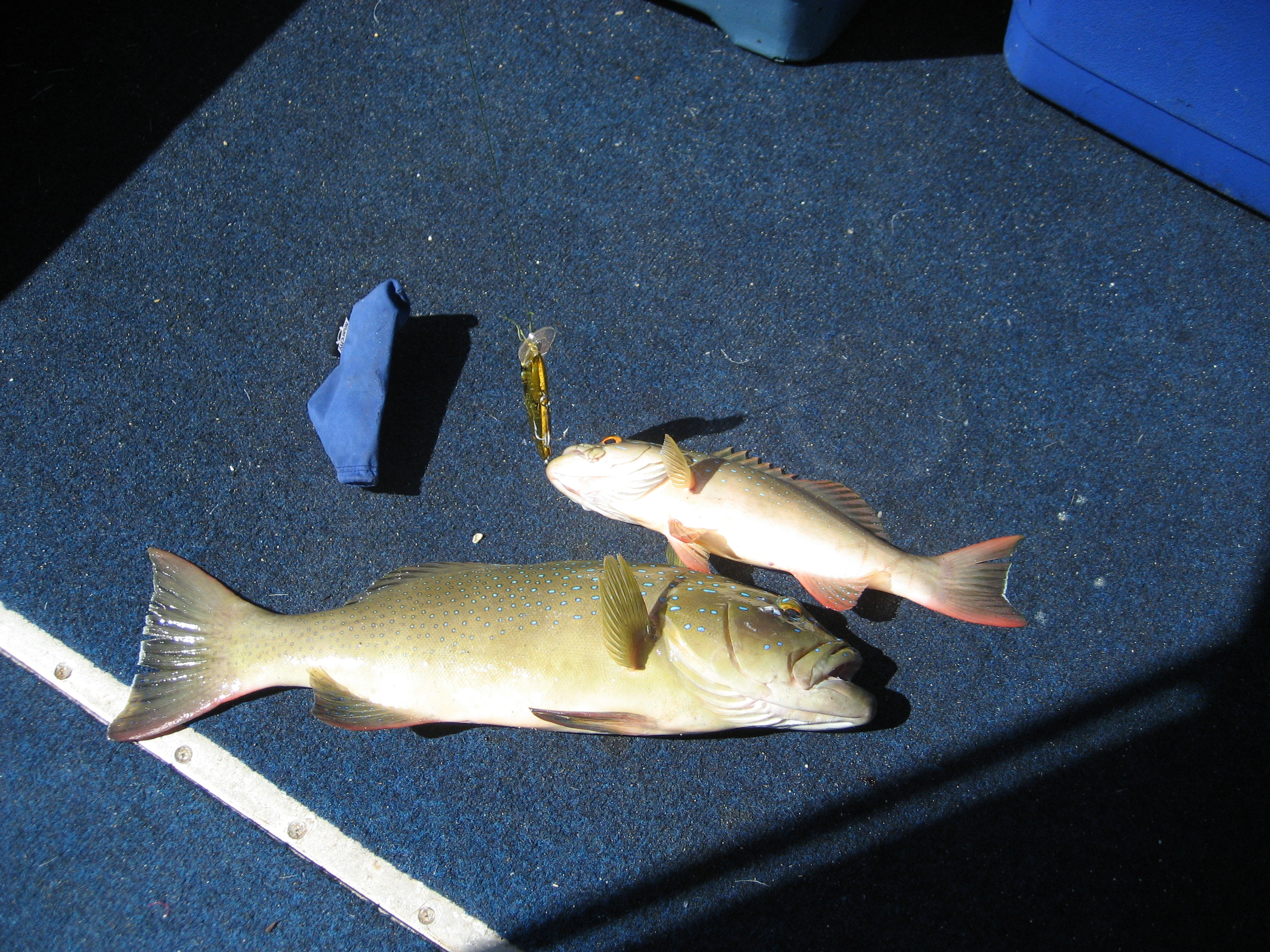 i only wanted to keep 1 but the smaller of the ones in the photo inhaled a treble and didn't release well so i scooped him back in and gave him to the neighbour. i stopped trolling for a while and chucked a popper out but after about 10 minutes there was no joy so i drove away from the queenies and chucked the lures out again.