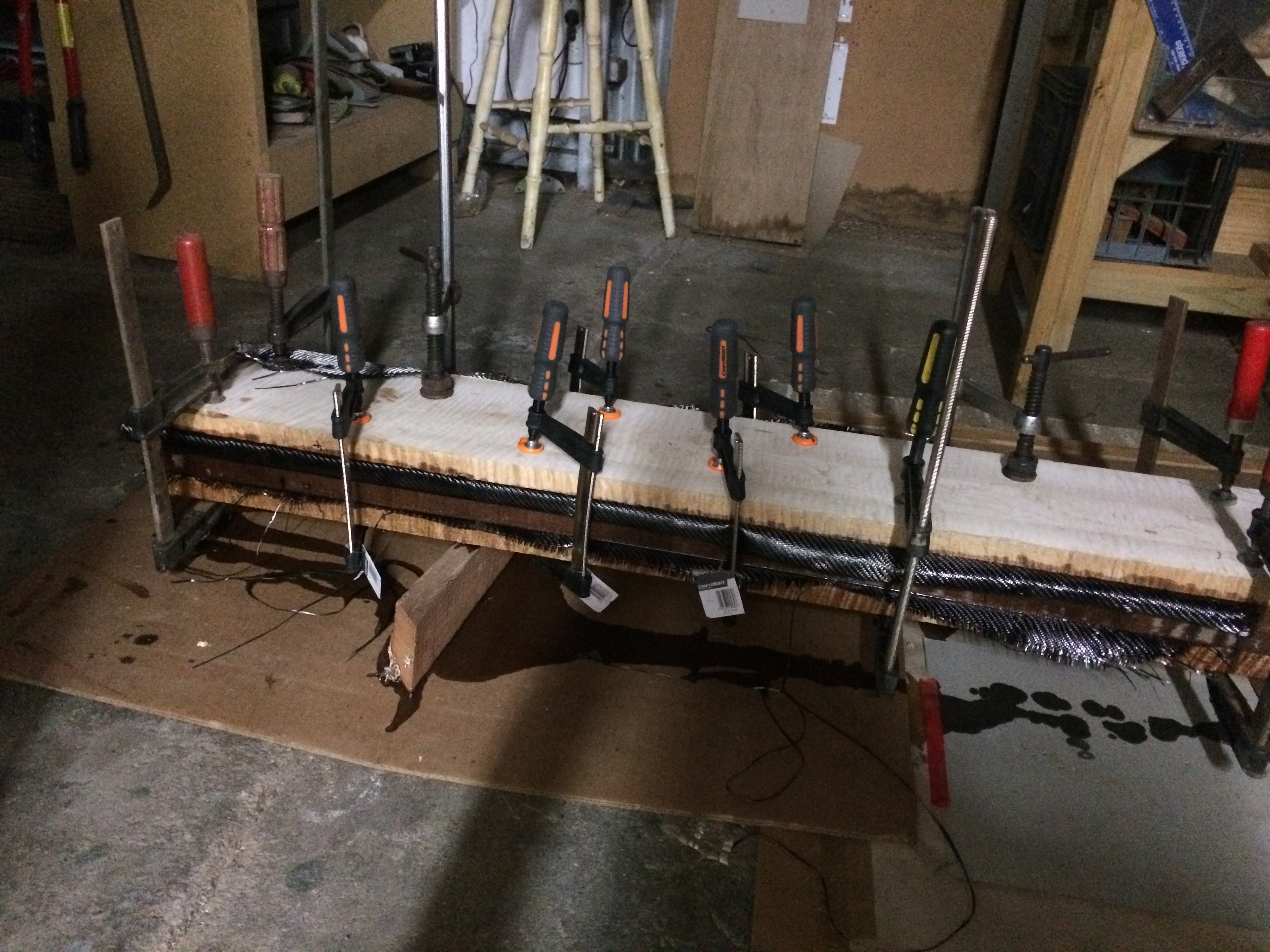 here is the latest one ready to go in the duplicator. Figured walnut & tiger maple with 3 layers of carbon fibre. I normally press them when gluing but it has another blank in it!