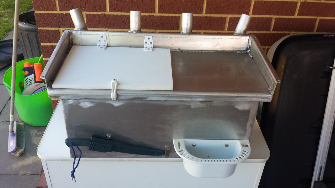 I would have made the cutting board the whole length and glued the ali cutout section to the back of the board to act as a plug and removed the rubber latch as it will get in the way then filleting fish.What about a drain for the board ?