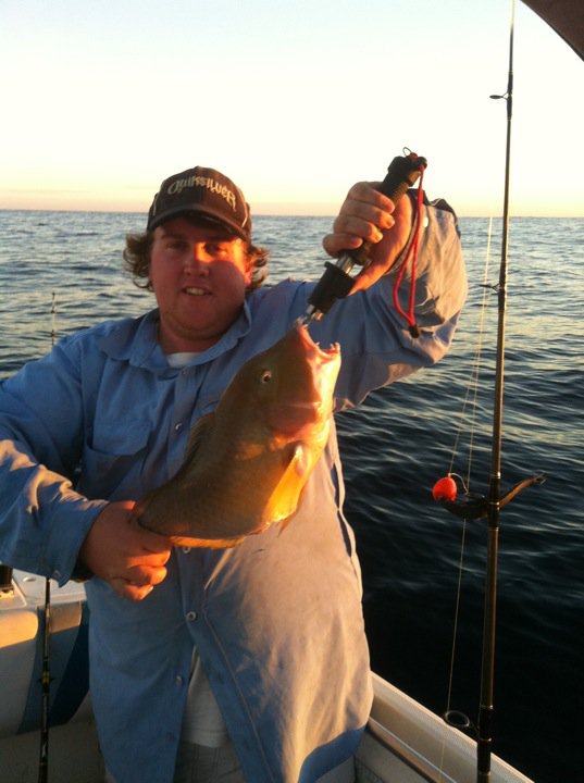 Hey guys. we had a late morning start yesterday at 11am out of two rocks. the swell was kickin it and it made for some fun on the way out. glad we had travelcalm or i woulda been burleying for the whole day. anyway, i started off with plastics - 7inch Slams. got some good smacks but no hookups. Rob then switched to bait and soon had a sgt. baker on board. put him into the tank for bait if we ran out. i then switched to bait, and that drift managed a just undersized dhuie and a tiny blackass. next drift, rob managed to pull up a stonka blackarse, which went straight into the esky. i then managed a smaller blackarse, but he also went into the esky. things went a little quiet so we set up a redrift, and just as crossed the mark, rob was on again. this time, a nice sized baldie. next drop, he had another baldie on board. in the meantime, i managed to pull about about 3 tiny blackarse, one scorpionfish (or spiky,poisonous thing) and a large norwester. in the next 3 hours, we had little luck. we finally managed to hit a good patch, which resulted in rob and i hooked up. my fish was a nice baldie; robs was a very nice queenie. the next fish up, after a long fight, had us calling a big dhuie, arose a big blackarse. we already had 2 on board, so we released the guy with the release weight. felt good releasing it.