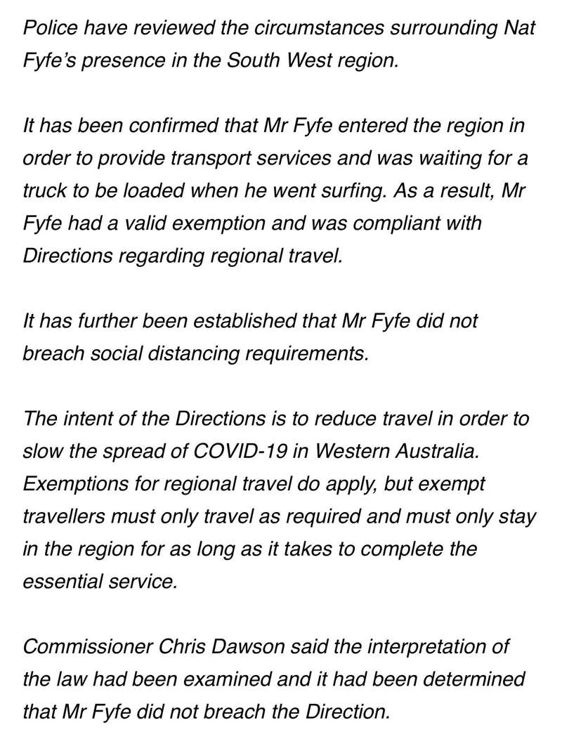 Always thought the rule was travel for work is allowed, don't see how surfing in another region is part of that work. Did his hockey mate meet him at the beach or was he social distancing in the same truck cabin, Different rules for different people...A mate of mine got pulled over yesterday and asked why he was driving around whilst going to the garage for fuel. Meanwhile our indigenous cousins that the goverment is so full on protecting by locking down every aspect of the kimberley still continue to sit on the towns oval in large groups but thats ok because they know they won't be fined for it. Just another example of different rules for different people.