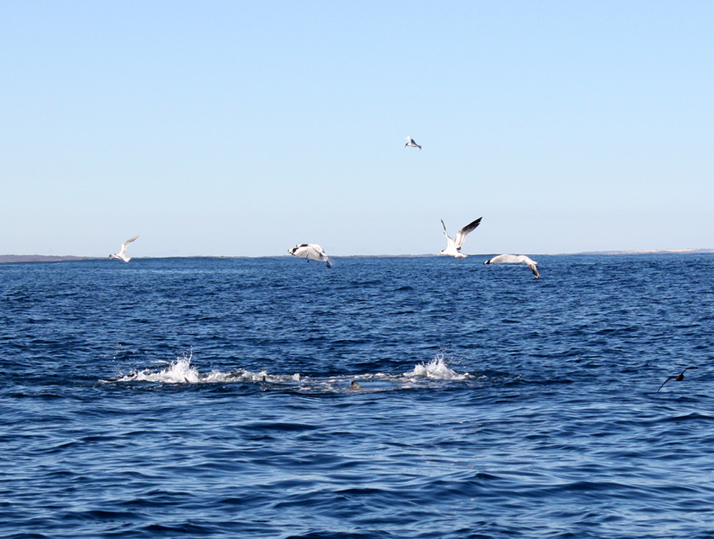 Things started off rather quiet with no bait schools on the sounder. We pushed on south and soon spotted a nice looking current line roughly SW of Boulanger Island. As we got close the water errupted around the boat with bait jumping everywhere, tuna launching into the air and in amongst it all sharks getting in on an easy feed!