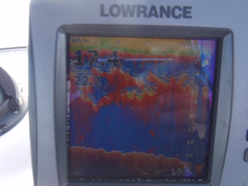 trouble is finding the right school.We found it was the bait schools busting up the surface,they were just generally feeding. It was the bait schools in the middle colum of the water and spread between the depth colum, we got all our SBT on. I have a couple sounder shots ill chuck them up. One day we had a school of SBT in 8-10m off rocky point.That was when we had our warmest water at 22.8. Generally they were found beween 17-30m.